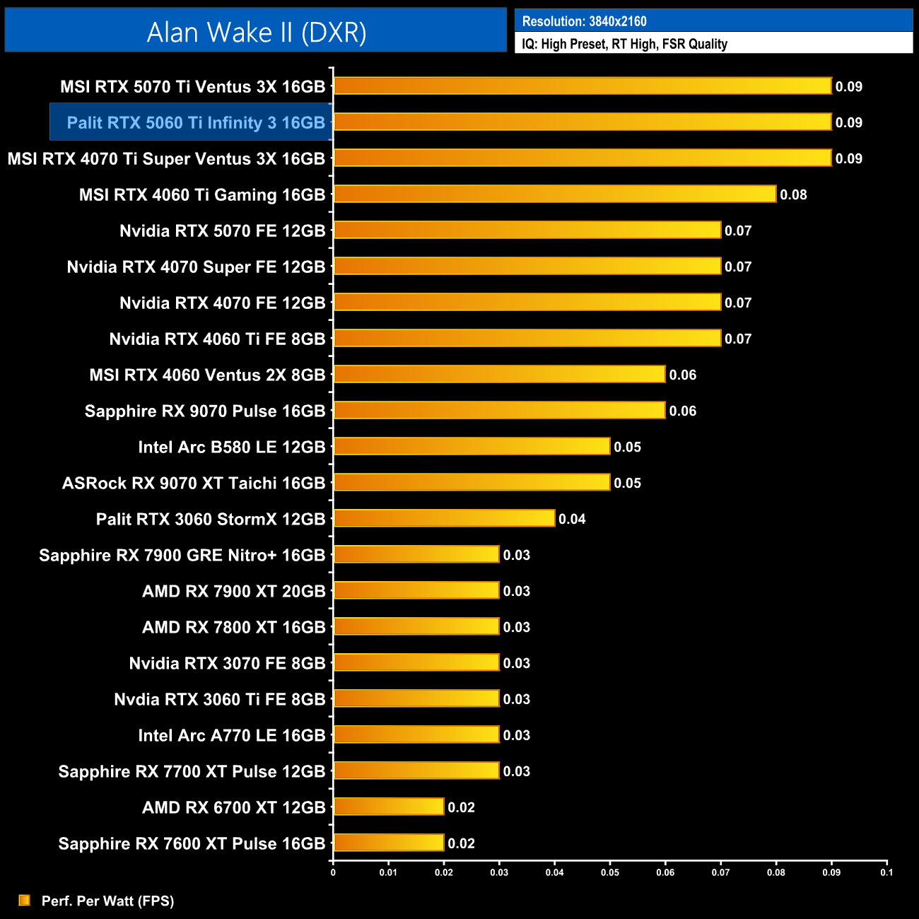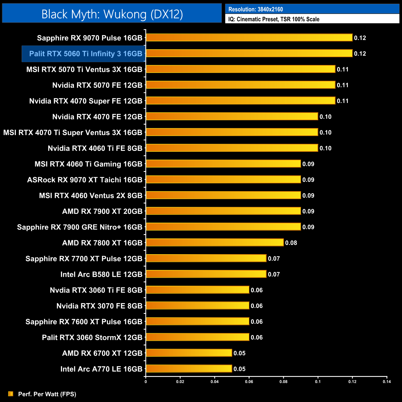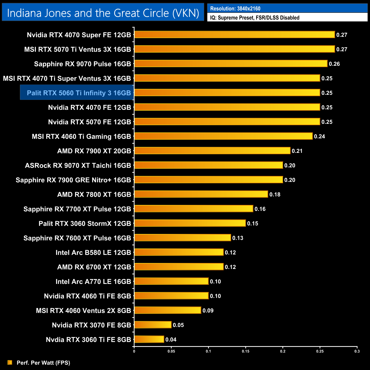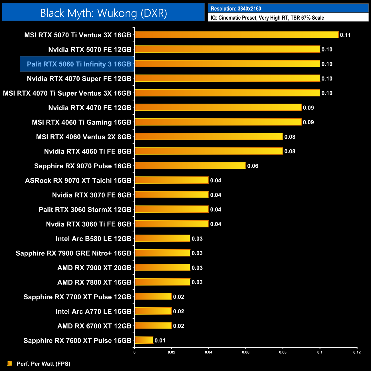 Using the graphics card-only power draw figures presented earlier in the review, here we present performance per Watt on a per-game basis for all twelve games we tested at 2160p (4K).