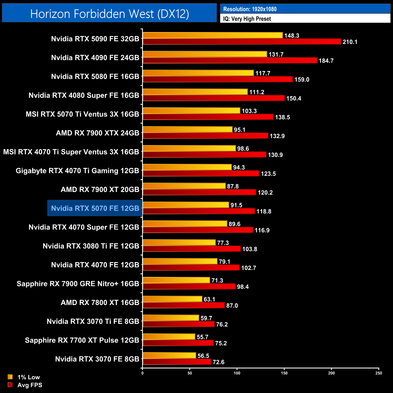 Nvidia GPUs fare better against their AMD counterpart in Forbidden West, with the 5070 now matching the 7900 XT at 1440p, but it offers just a 2% gain over the 4070 Super – basically nothing.