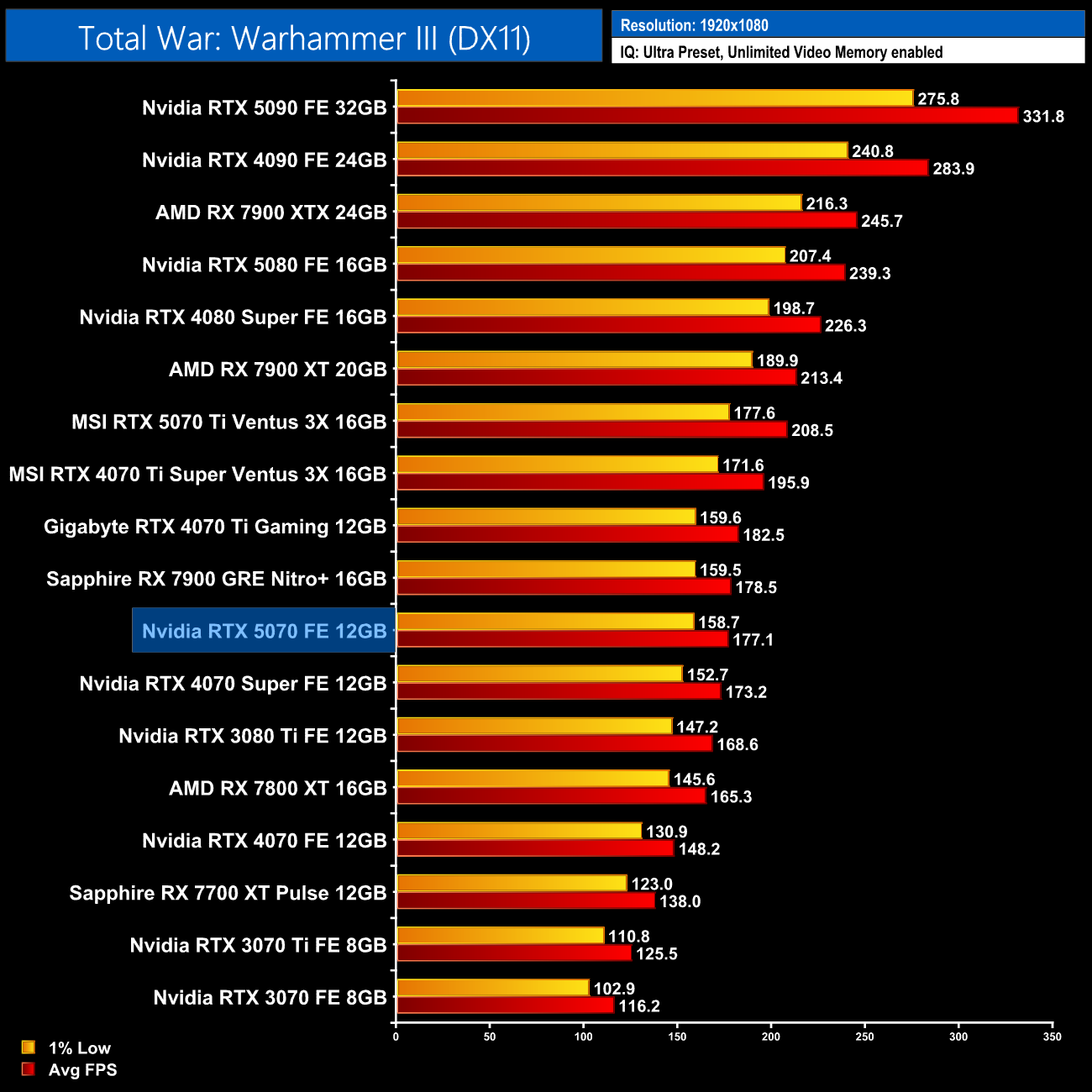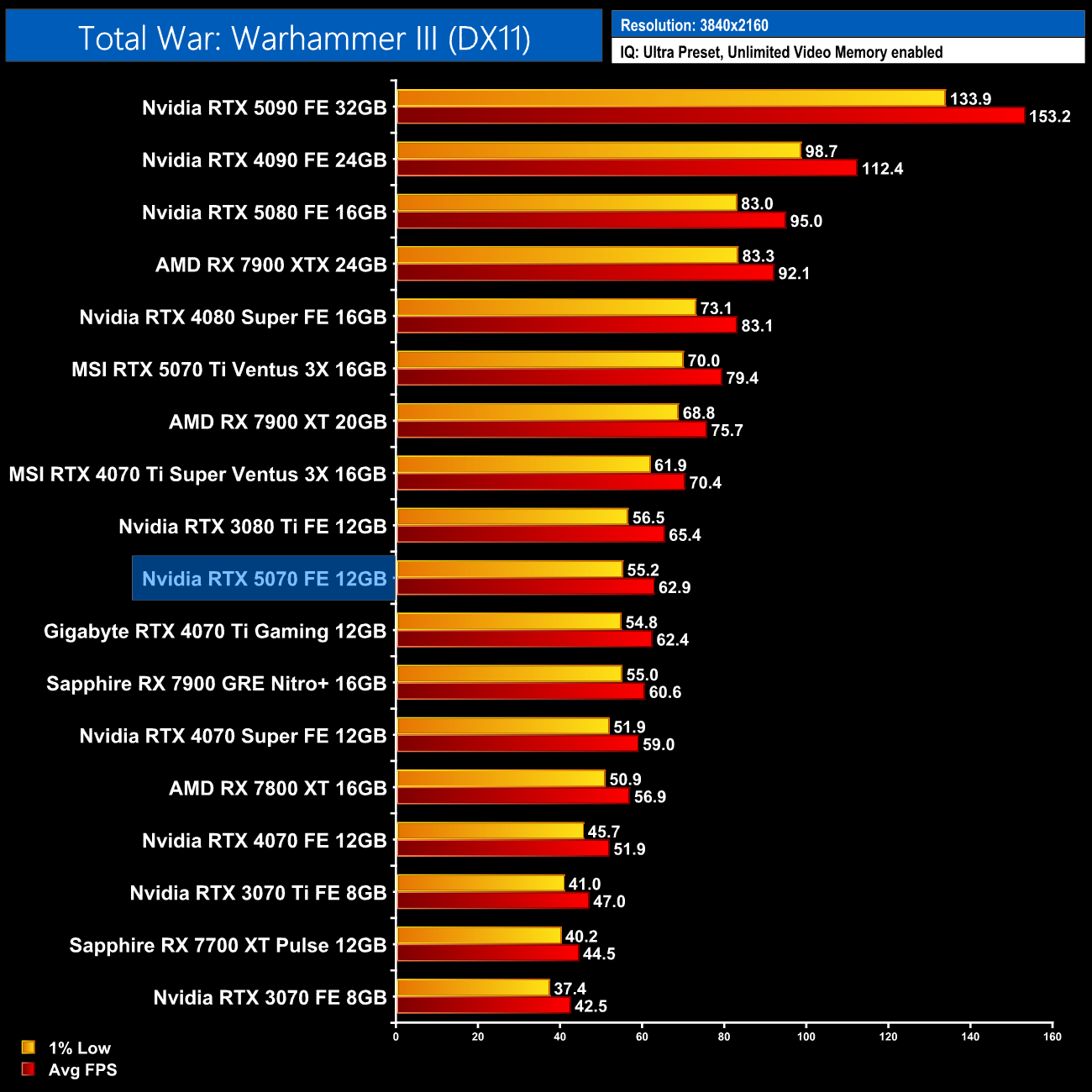 Lastly, Total War: Warhammer III once again sees the 5070 delivering equivalent performance to the 7900 GRE, while it claims just a 4% lead over the 4070 Super.