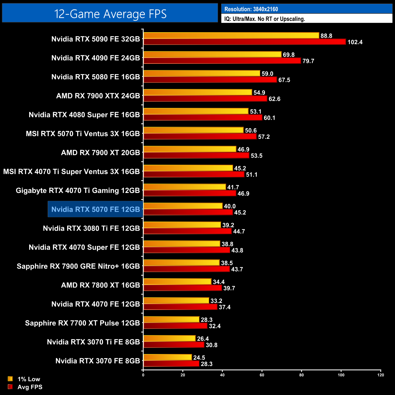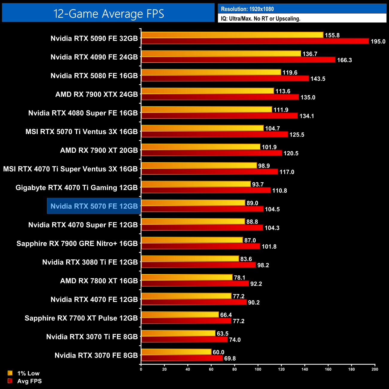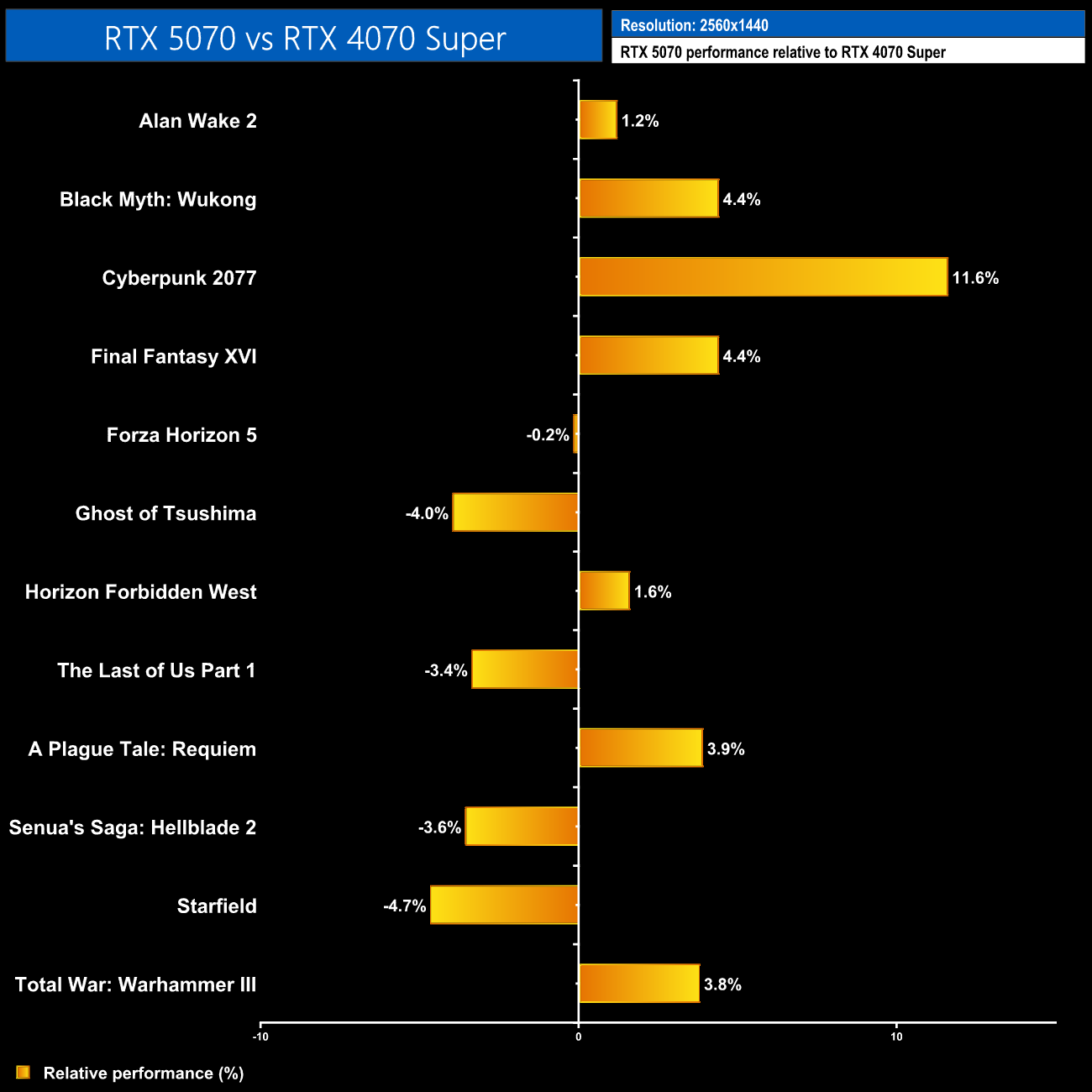 Here we take a closer look at the uplift over the 4070 Super – the last 40 series GPU released in this price bracket. At 1440p, the 5070 is anywhere from 5% slower to 12% faster over the twelve games tested.