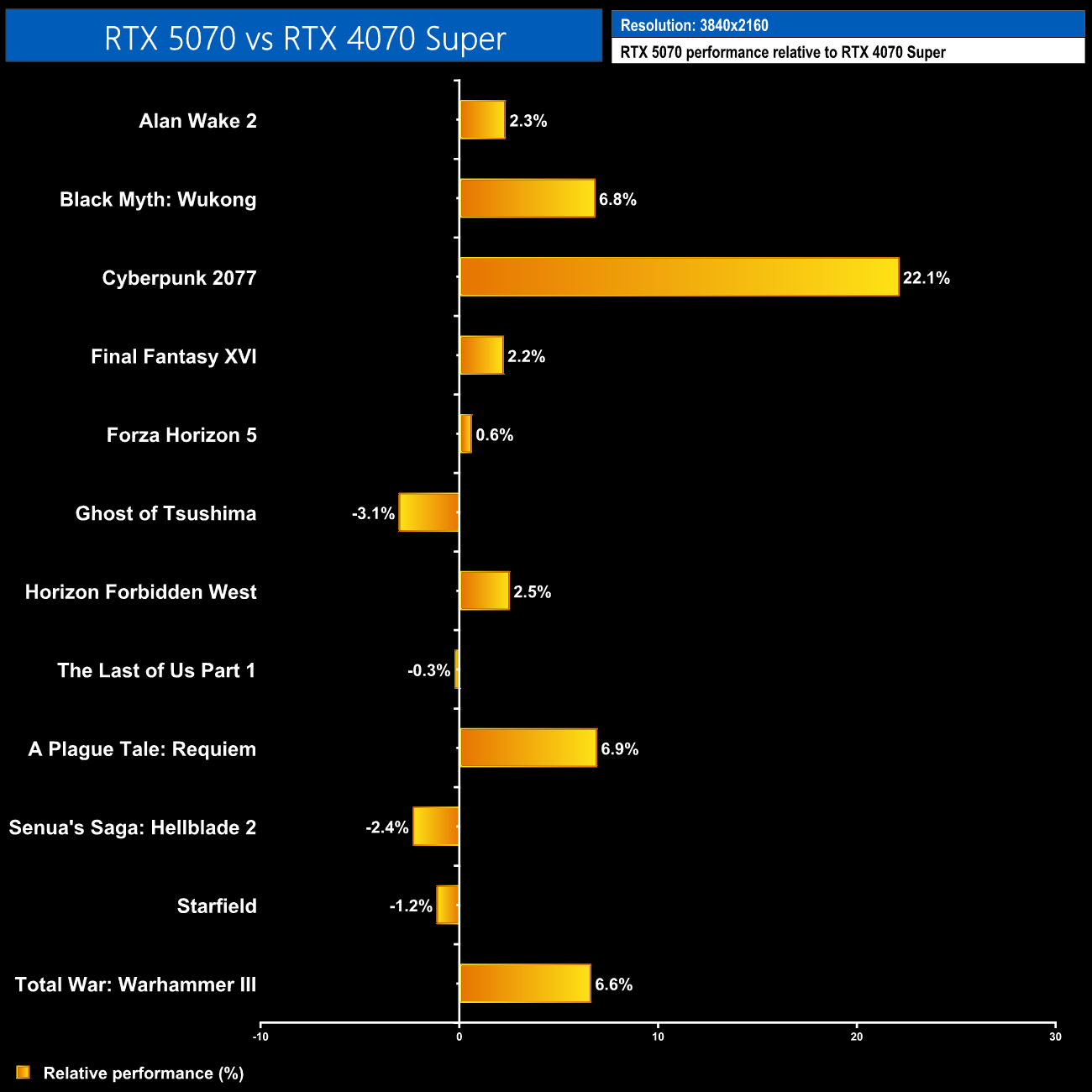The RTX 5070 does scale slightly better at 4K, though eight of the twelve games tested show less than a 5% difference between these two GPUs, in either direction. The Cyberpunk result is what we were hoping to see across the board, but it is a clear outlier.