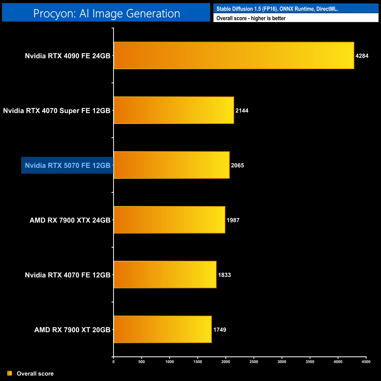 For our AI image generation test, the first thing to know is the 5070 actually failed to run our usual Stable Diffusion XL test due to a lack of VRAM. We tried again using the Stable Diffusion 1.5 tests and this worked fine, though performance isn't able to match the RTX 4070 Super.