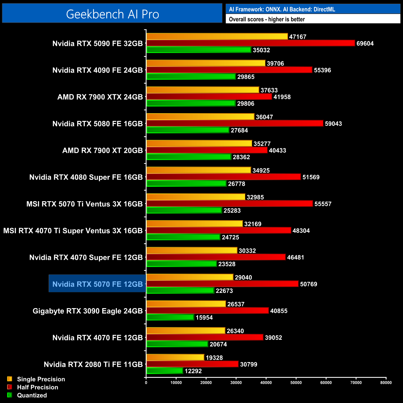 Geekbench AI continues to be a mixed bag, with single precision performance lacking, but the half precision metric shows vastly superior results, this time with a 9% lead over the 4070 Super.