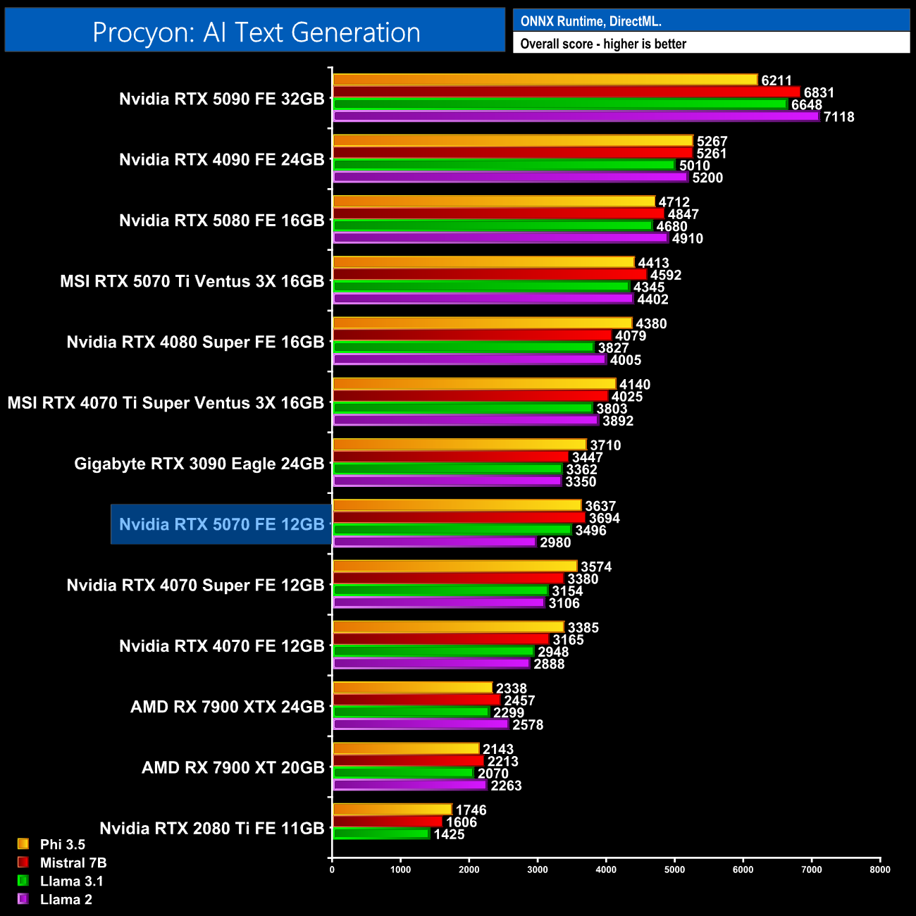 AI text generation fared slightly better, with up to an 11% gain over the 4070 Super using the Llama 3.1 model, though Llama 2 performance is slightly worse.