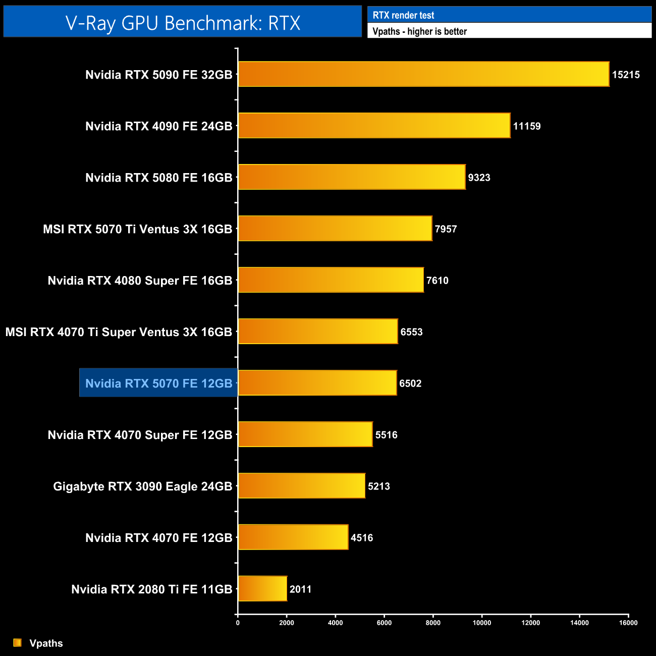 V-Ray also shows more appreciable gains when using the RTX path, this time with an 18% lead over the 4070 Super, one of the biggest differences we have seen today.