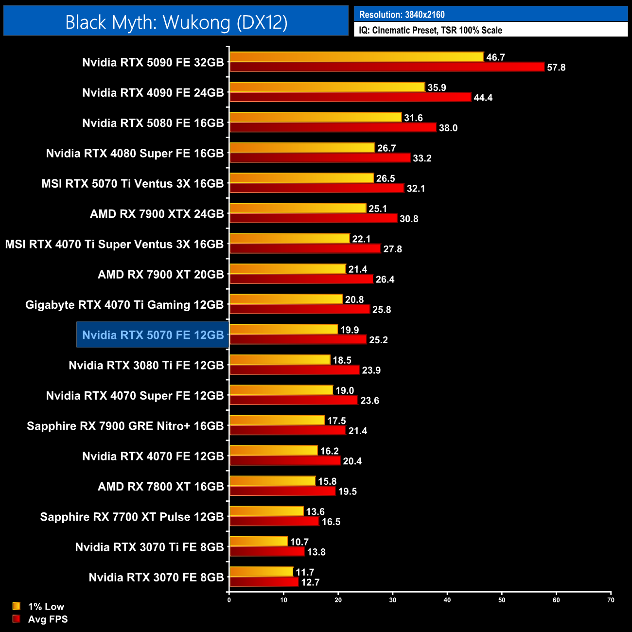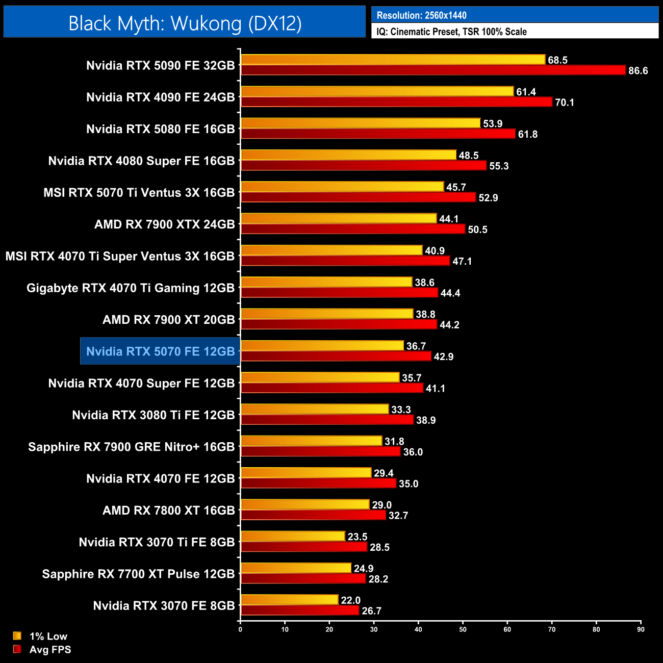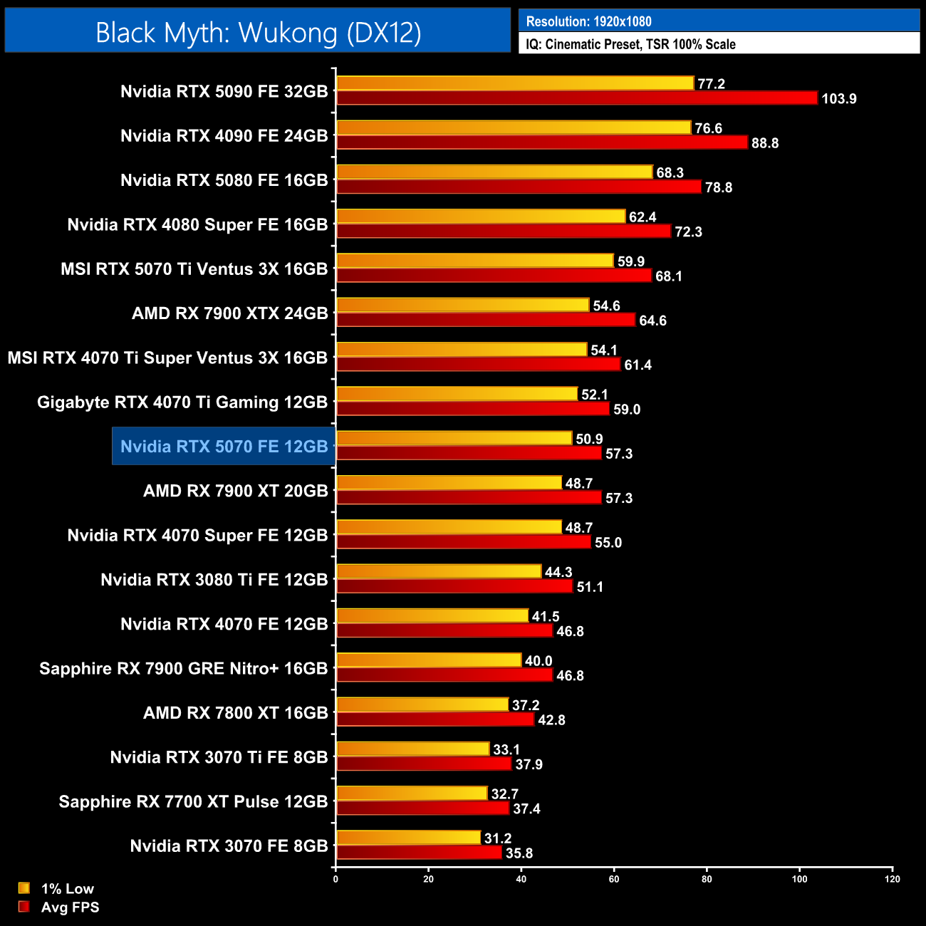 Black Myth: Wukong scales better on Nvidia GPUs, and at 1440p the RTX 5070 is only a hair behind AMD's RX 7900 XT. It's only 4% ahead of the RTX 4070 Super, though, and that works out as a 23% gain over the original RTX 4070.
