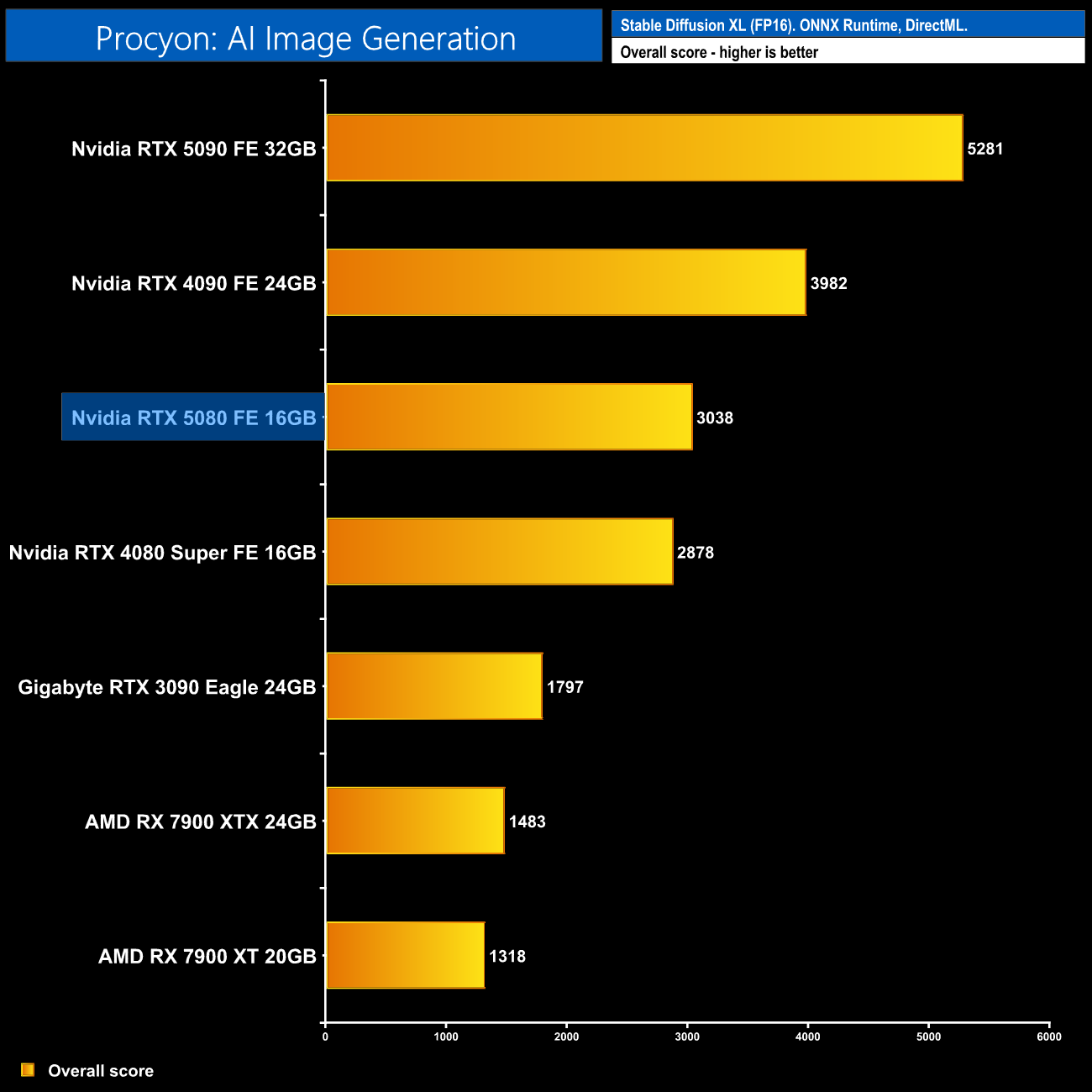 Starting with our Stable Diffusion XL FP16 image generation test, here the RTX 5080 delivers just a modest 6% gain over the RTX 4080 Super, while it's 24% slower than the RTX 4090.