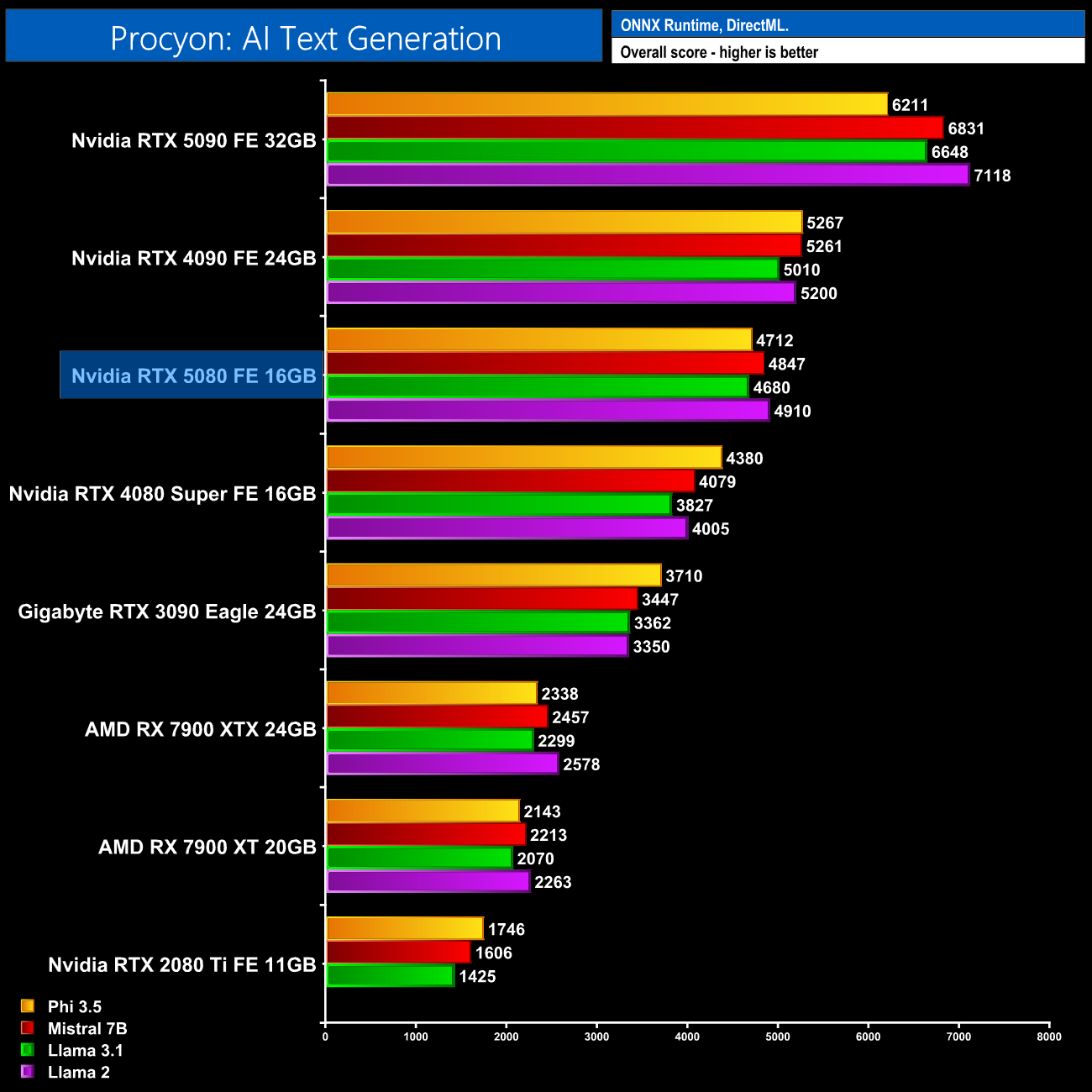 There are more positives to take from the AI Text Generation test however, particularly looking at performance from the two Llama models – in both cases, the RTX 5080 delivers gains of over 20% compared to the RTX 4080 Super.