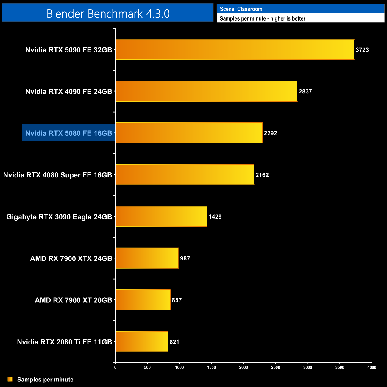 Moving onto Blender performance, we're once again look at just a 6% gain over the RTX 4080 Super.