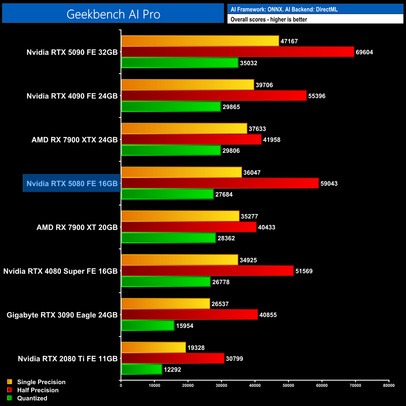 Geekbench AI Pro's performance is more mixed, with the single precision results slightly slower than even the RX 7900 XTX, but the half precision results are faster than even the RTX 4090 and mark a gain of 14% over the RTX 4080 Super.