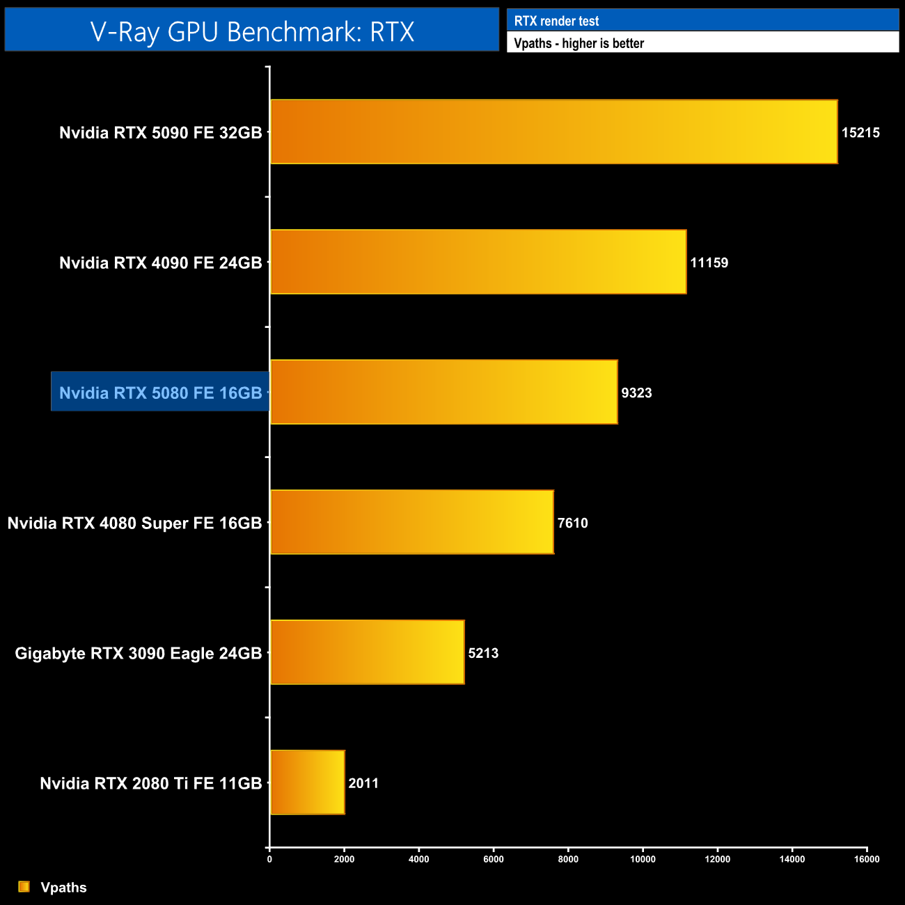 V-Ray GPU Benchmark is more impressive, however, when using the RTX path. Here, the RTX 5080 is 23% faster than the 4080 Super and 16% slower than the 4090.