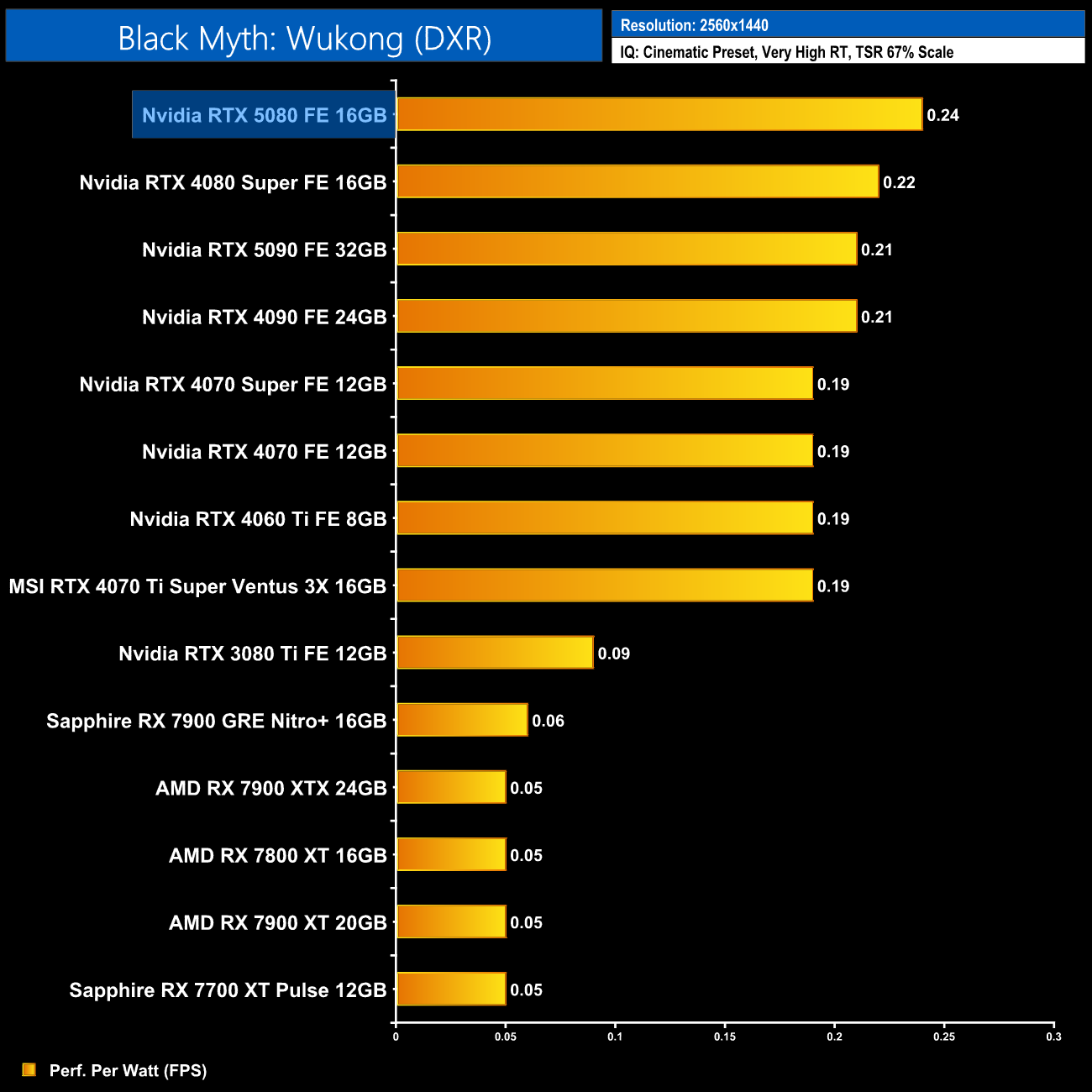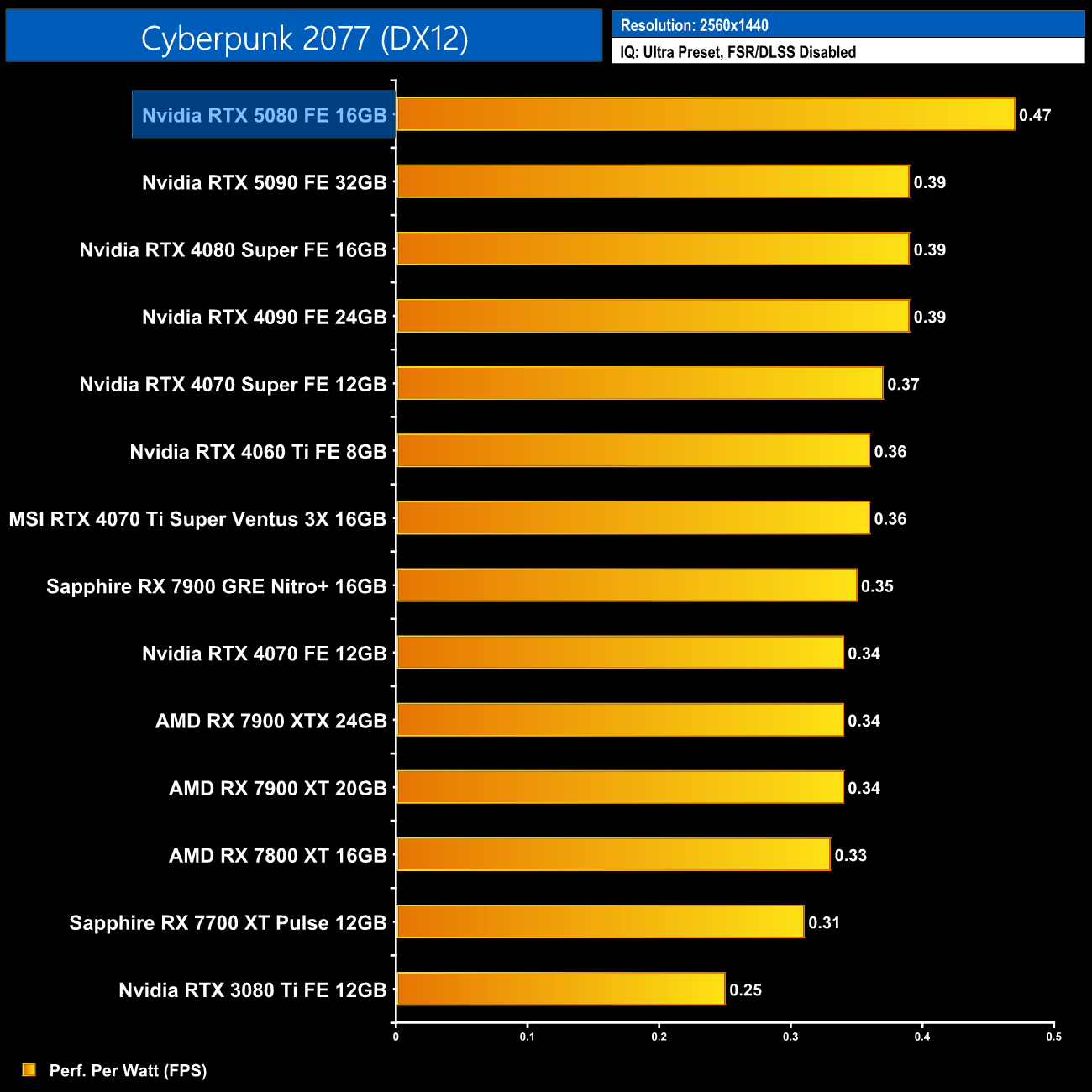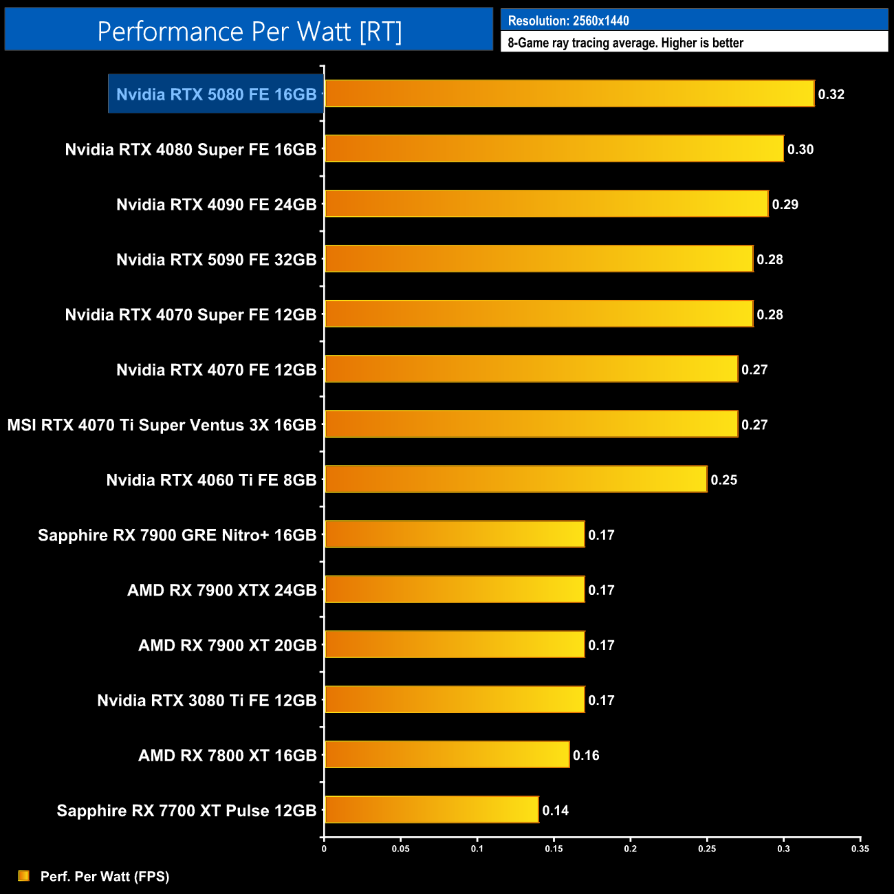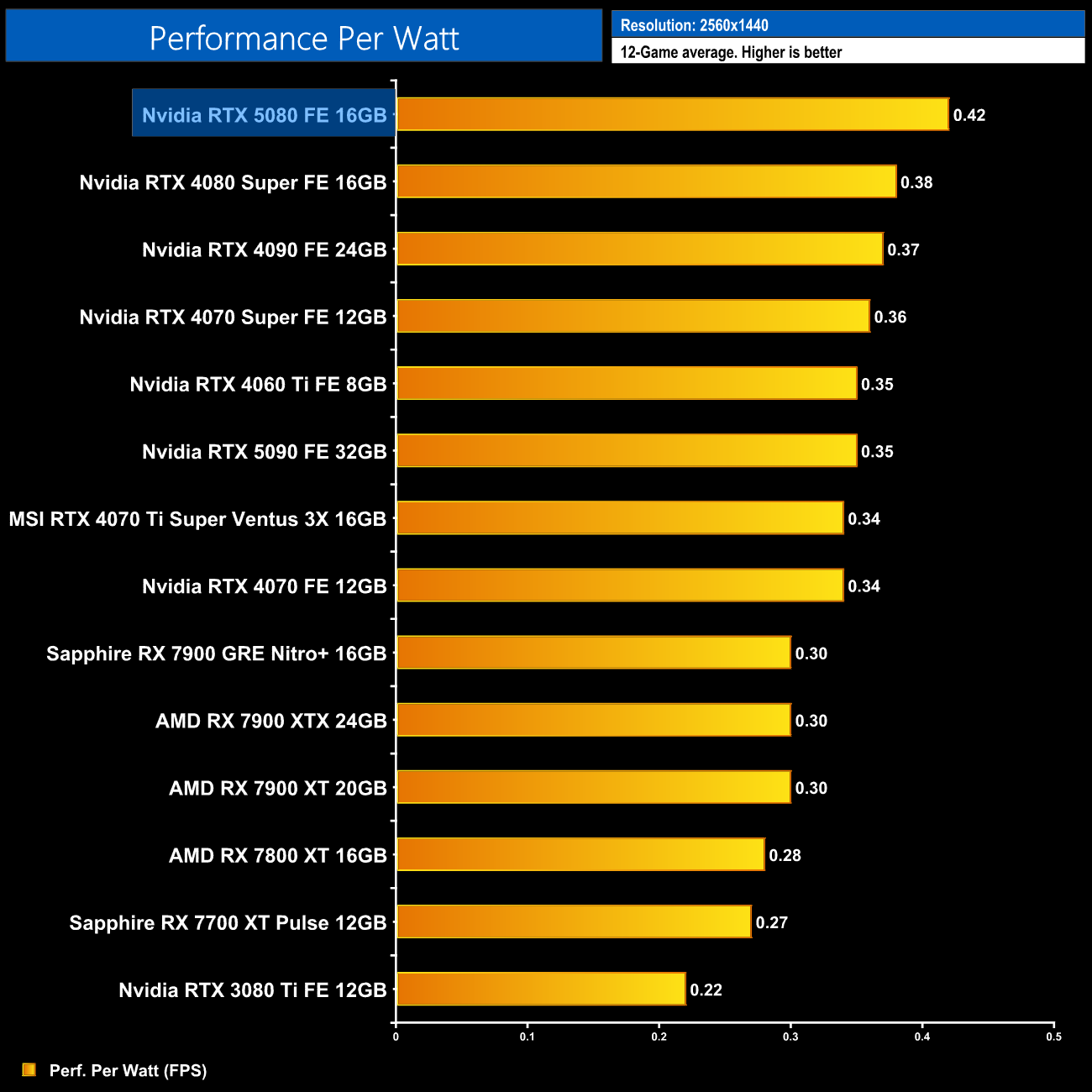 We see a similar margin at 1440p, too, with the RTX 5080 still proving to be 11% more efficient than the RTX 4080 Super.