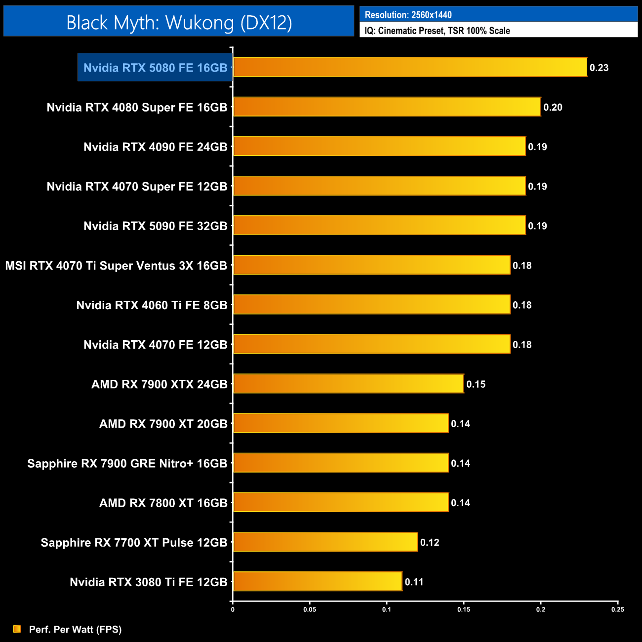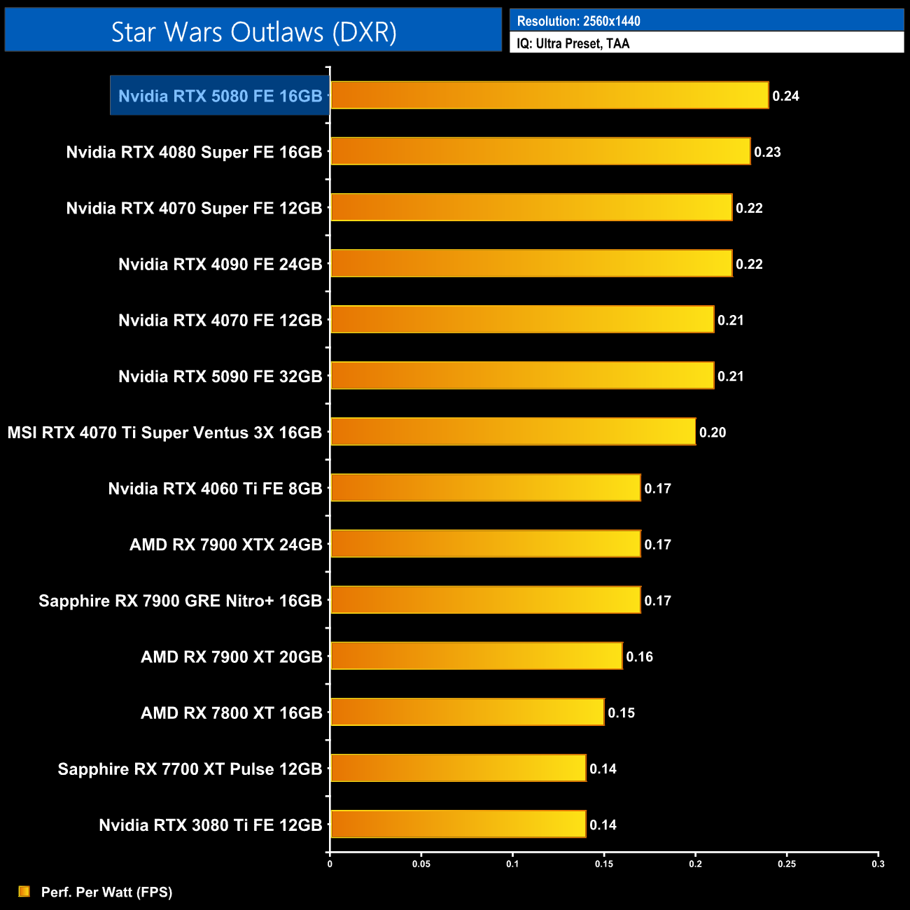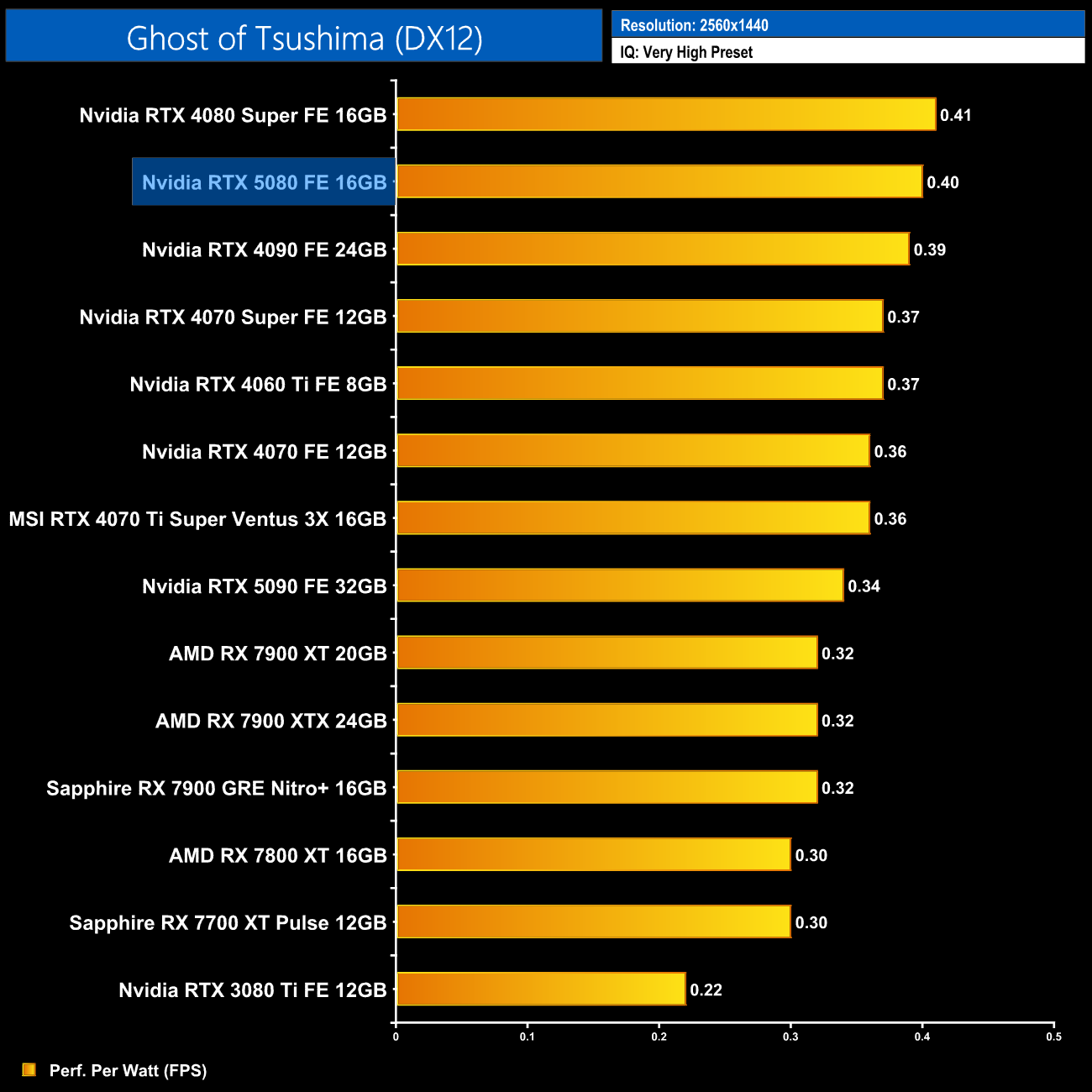 We see a similar margin at 1440p, too, with the RTX 5080 still proving to be 11% more efficient than the RTX 4080 Super.