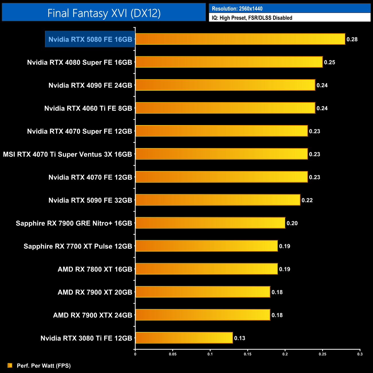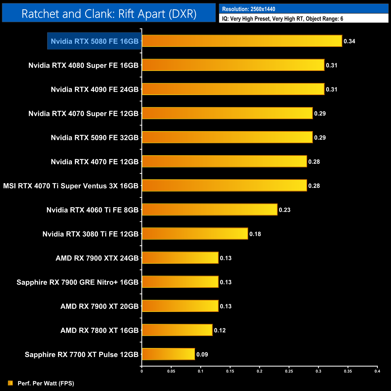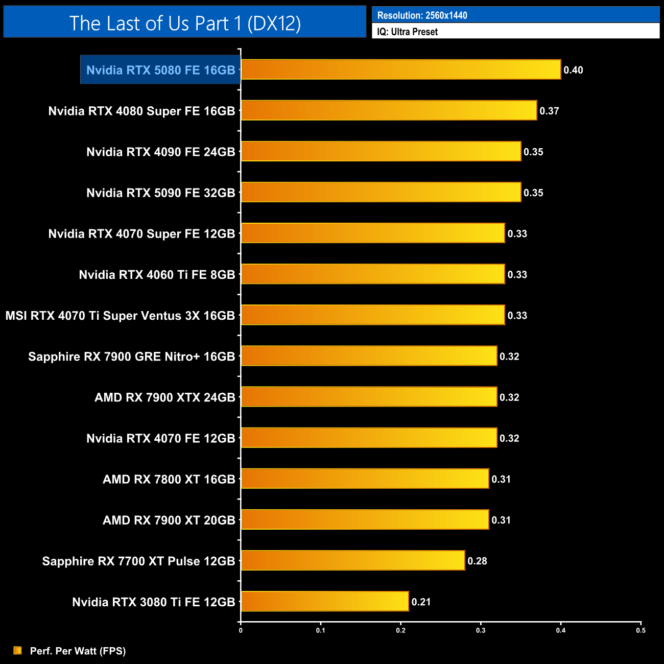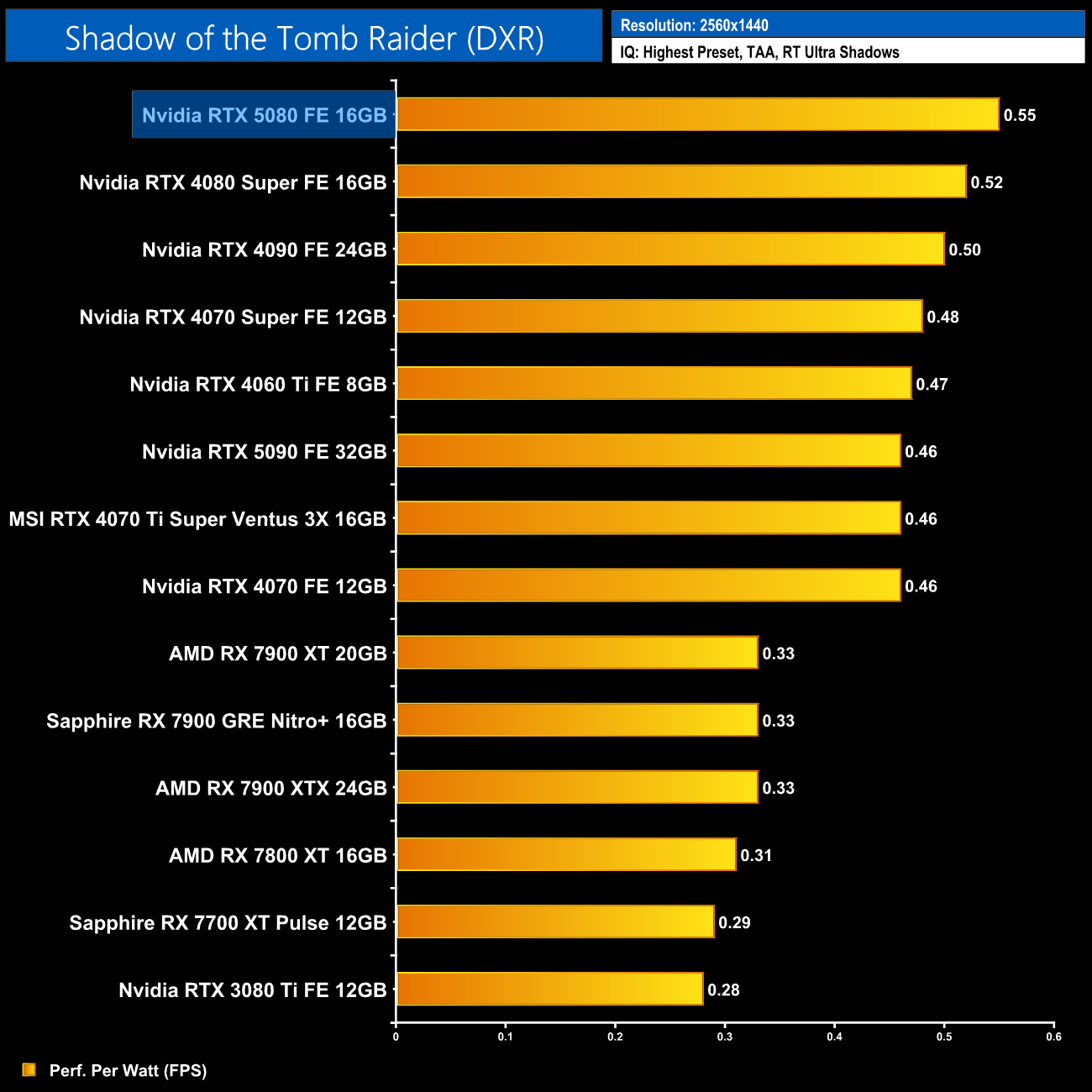 We see a similar margin at 1440p, too, with the RTX 5080 still proving to be 11% more efficient than the RTX 4080 Super.