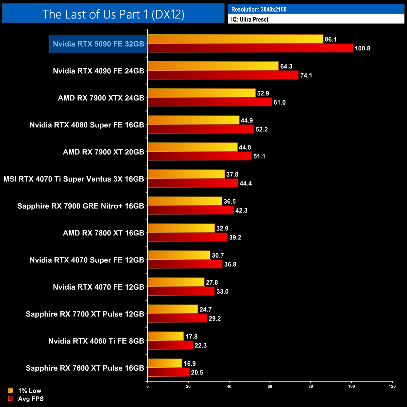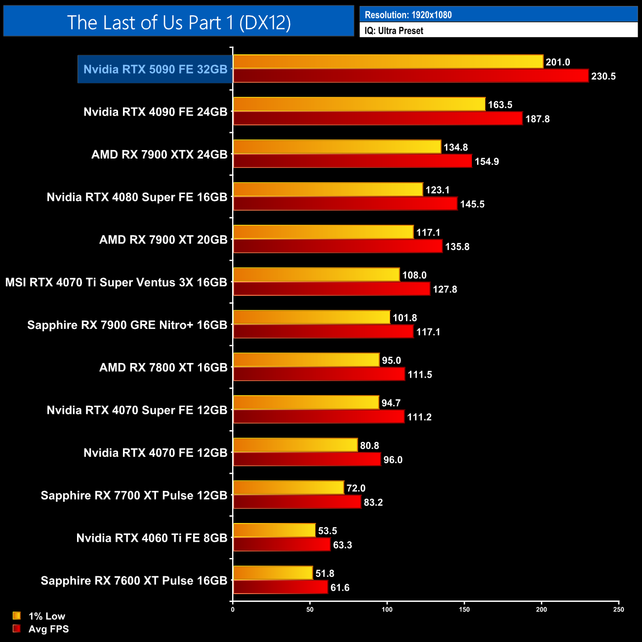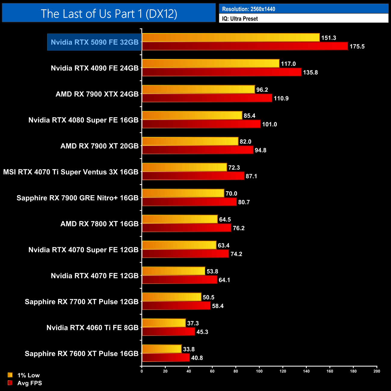 Moving onto The Last of Us Part 1, this does get the RTX 5090 back on track with an average of 176fps at 1440p, making it 29% faster than the 4090 and 65% ahead of the 7900 XTX.