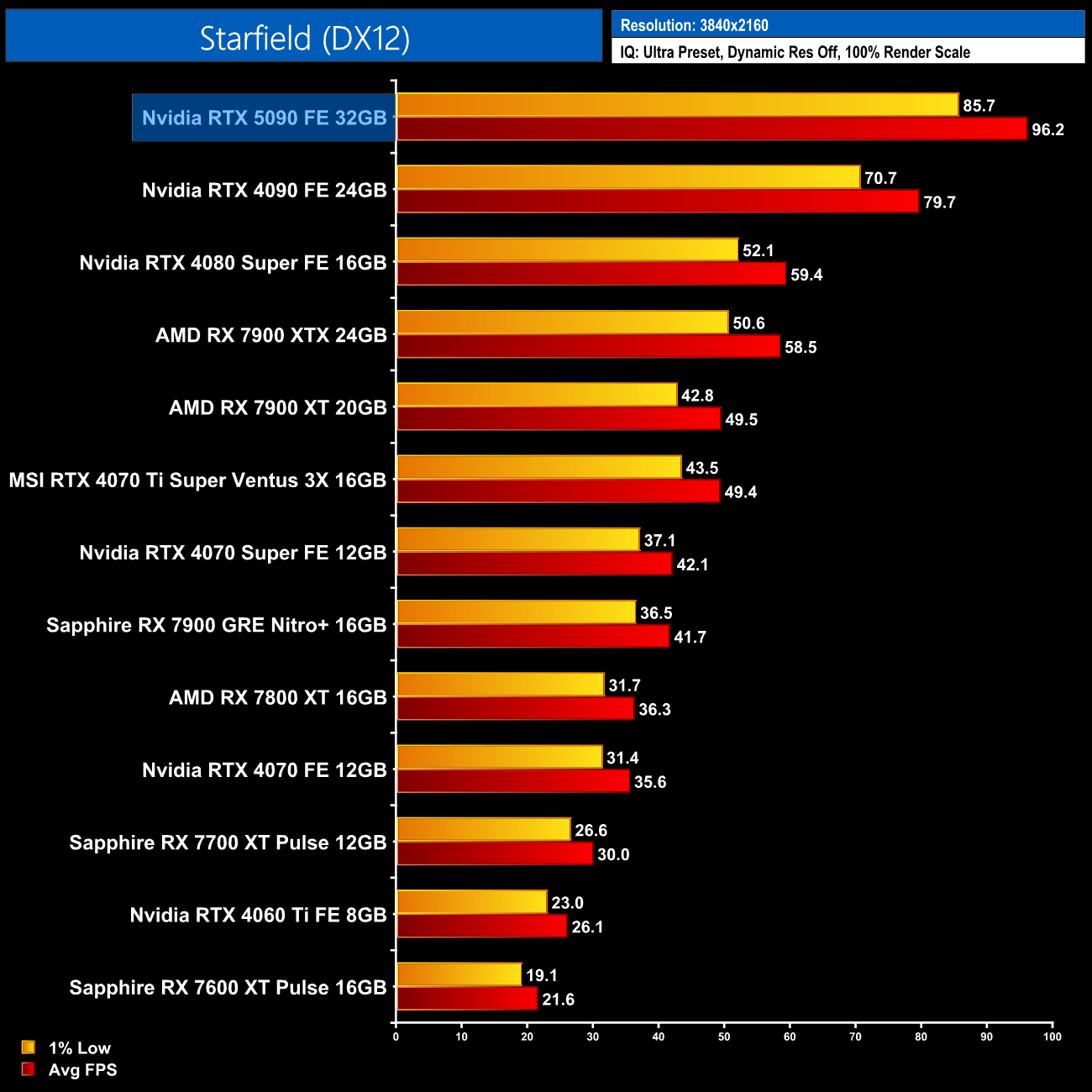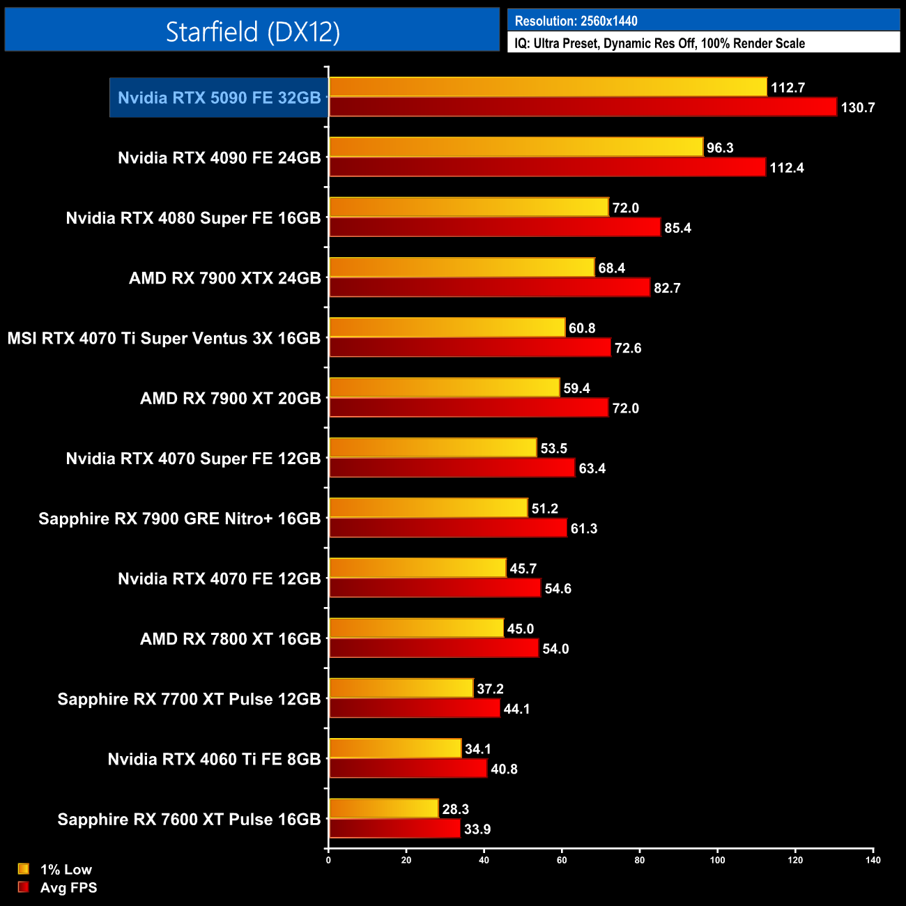 Starfield is another one where we see disappointing improvements compared to the 40-series, or specifically the 4090. At 1440p for instance, the 5090 is just 16% faster, and while it is possible, I don't think we are CPU limited here, with GPU utilisation reporting at 98%.