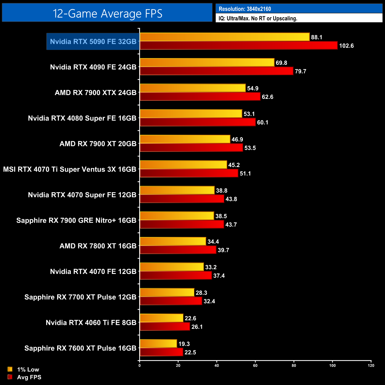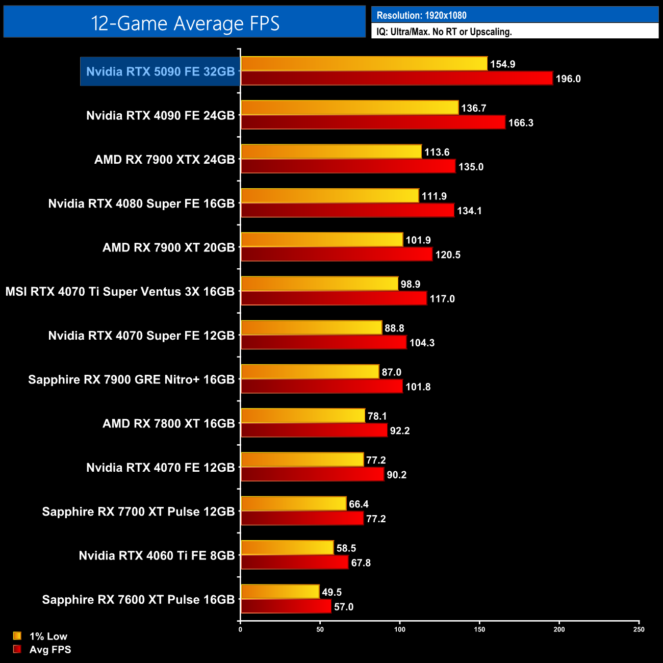 Looking at the 12-game average results, for rasterisation the RTX 5090 comes in 22% faster than its direct predecessor, the RTX 4090, when testing at 1440p. That also makes it 54% faster than the RX 7900 XTX and a 57% uplift compared to the 4080 Super.
