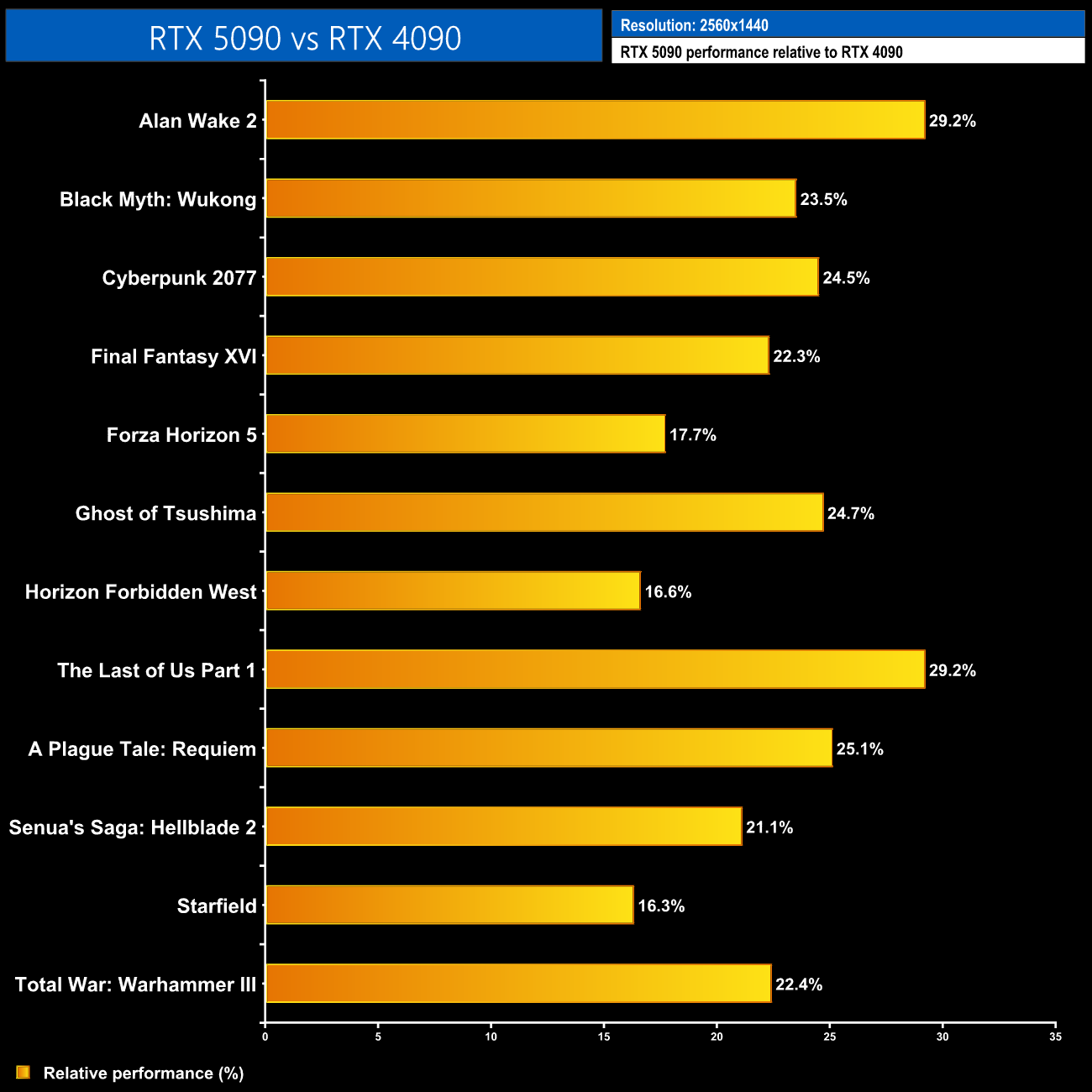 Just to break down the performance versus the RTX 4090, here we can see the relative performance gains for the 5090 over its predecessor. At 1440p it ranges from 16% up to 29% faster.