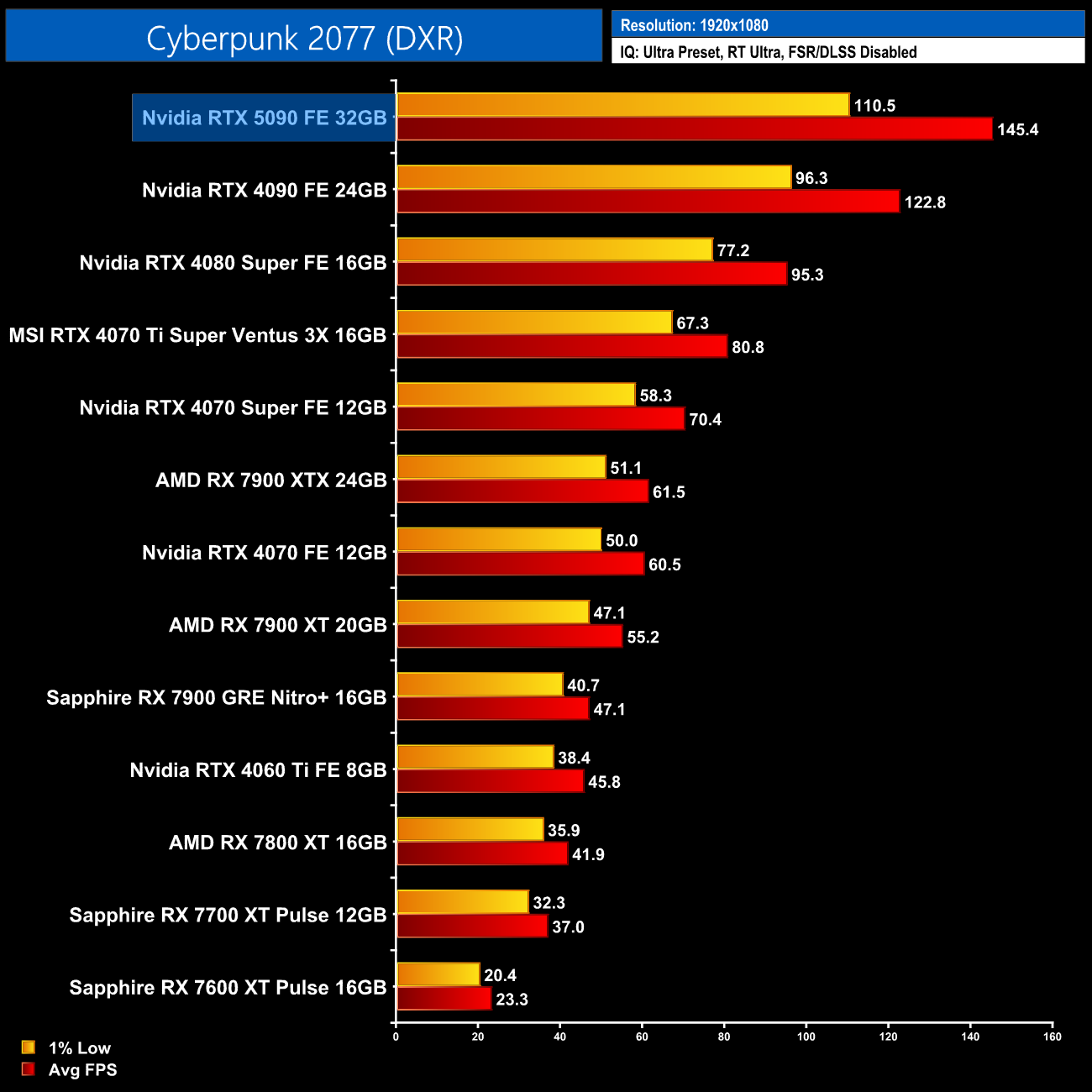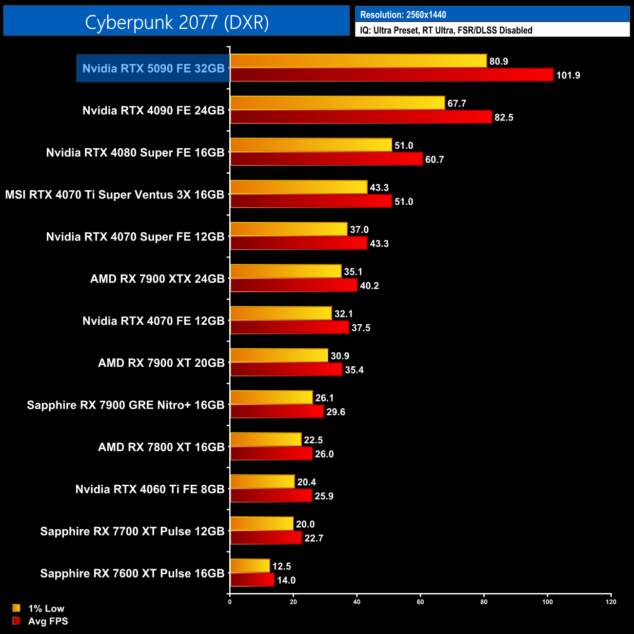 As for Cyberpunk, at 1440p the 5090 is capable of 102fps using the RT Ultra preset, though do note upscaling is disabled. That makes it 24% faster than the 4090, while it's well over double the performance of the RX 7900 XTX.