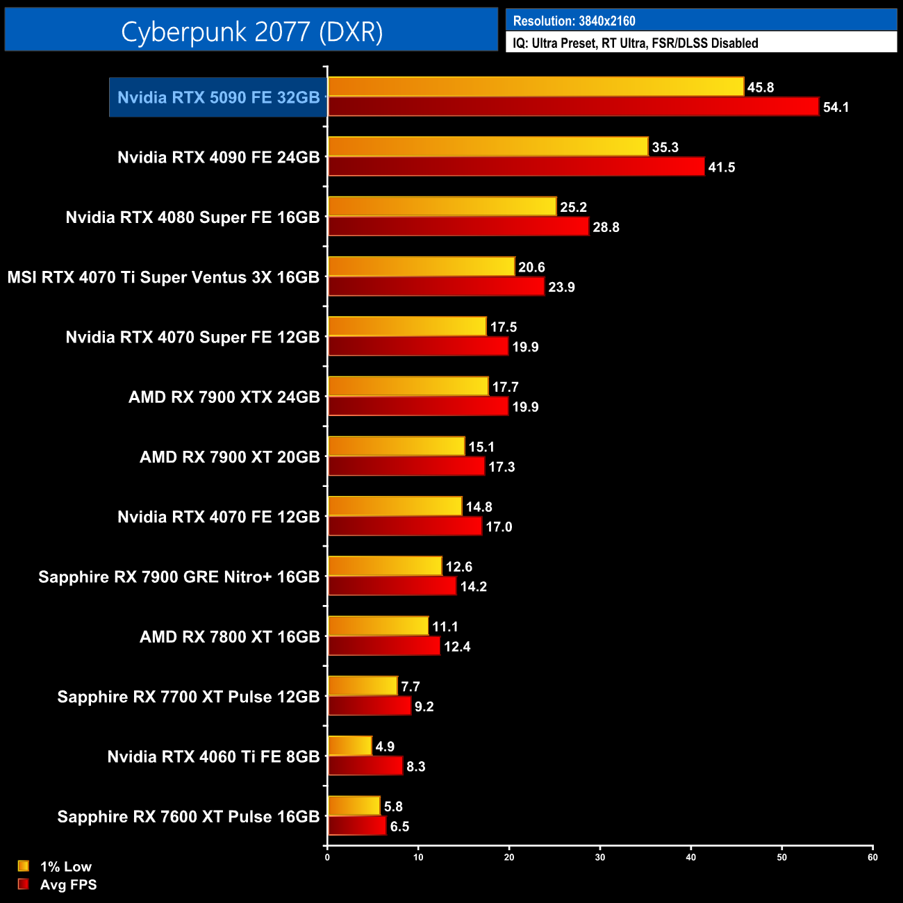 4K resolution once agains sees the 5090 extend its lead over the 4090, coming in 30% faster with an average frame rate of 54fps.