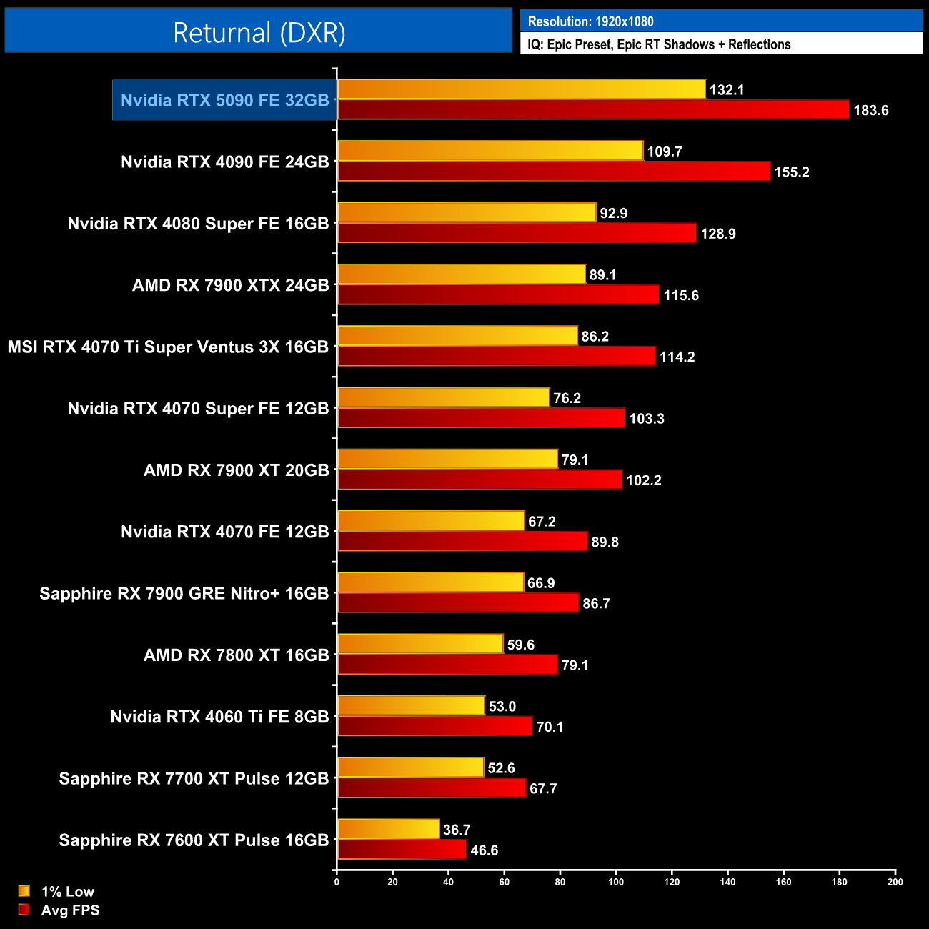 Next up is Returnal which only includes ray traced shadows and reflections, allowing the 5090 to cruise to 155fps on average at 1440p, though that's a relatively small 22% gain over the 4090.