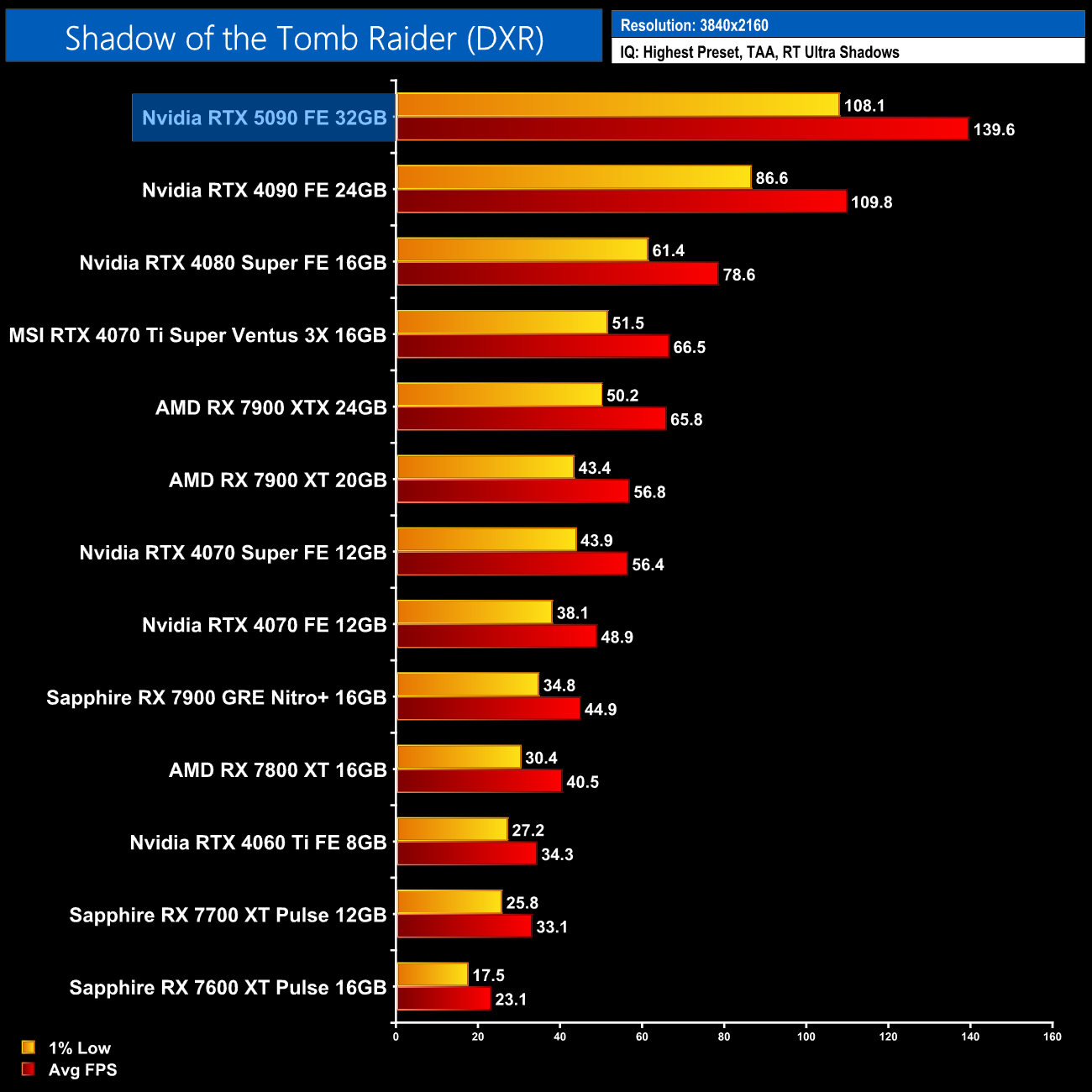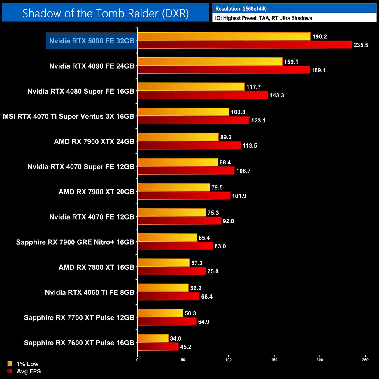 Shadow of the Tomb Raider feels like an ancient relic at this point – I've been benchmarking it since the days of the RTX 20-series, but it's still interesting to see how performance scales in games that only have a single RT effect. At 1440p, the 5090 hits an eye-watering 235fps – no DLSS required! – and that makes it 25% faster than the 4090.