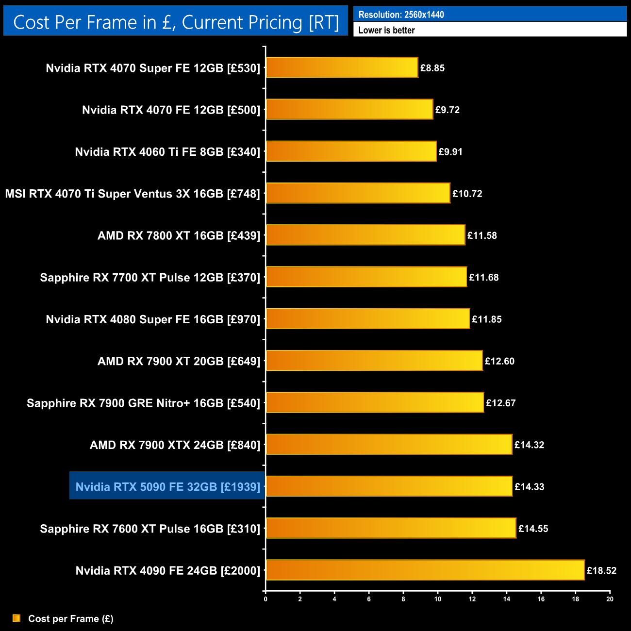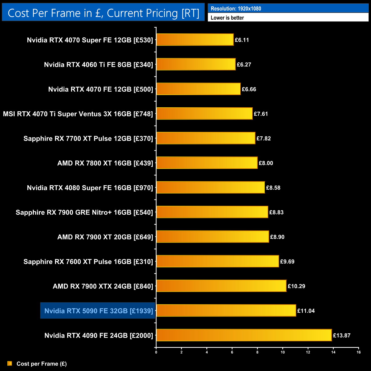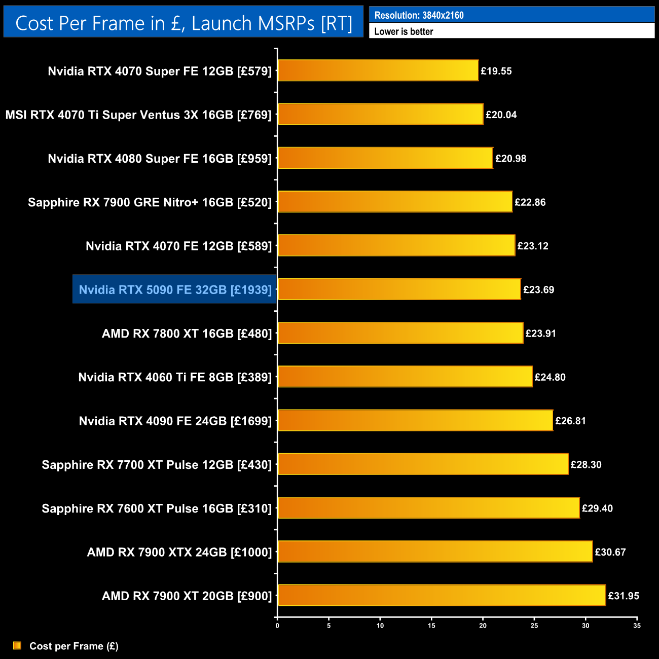 Interestingly, overall value does look considerably better when looking at the data based on our ray traced numbers. Granted, the 5090 is still hardly jaw-dropping in this regard, but its performance being so much better than anything AMD has to offer makes it a much better value if ray tracing is your primary concern. It remains to be seen if RDNA 4 is able to change that!