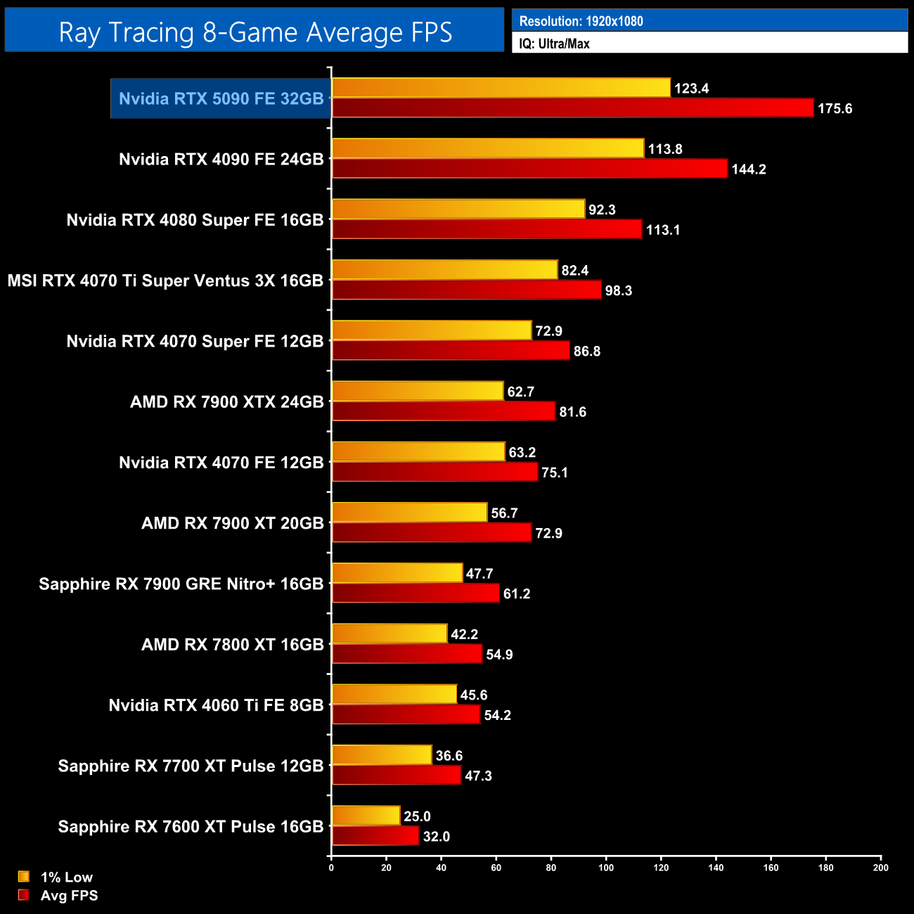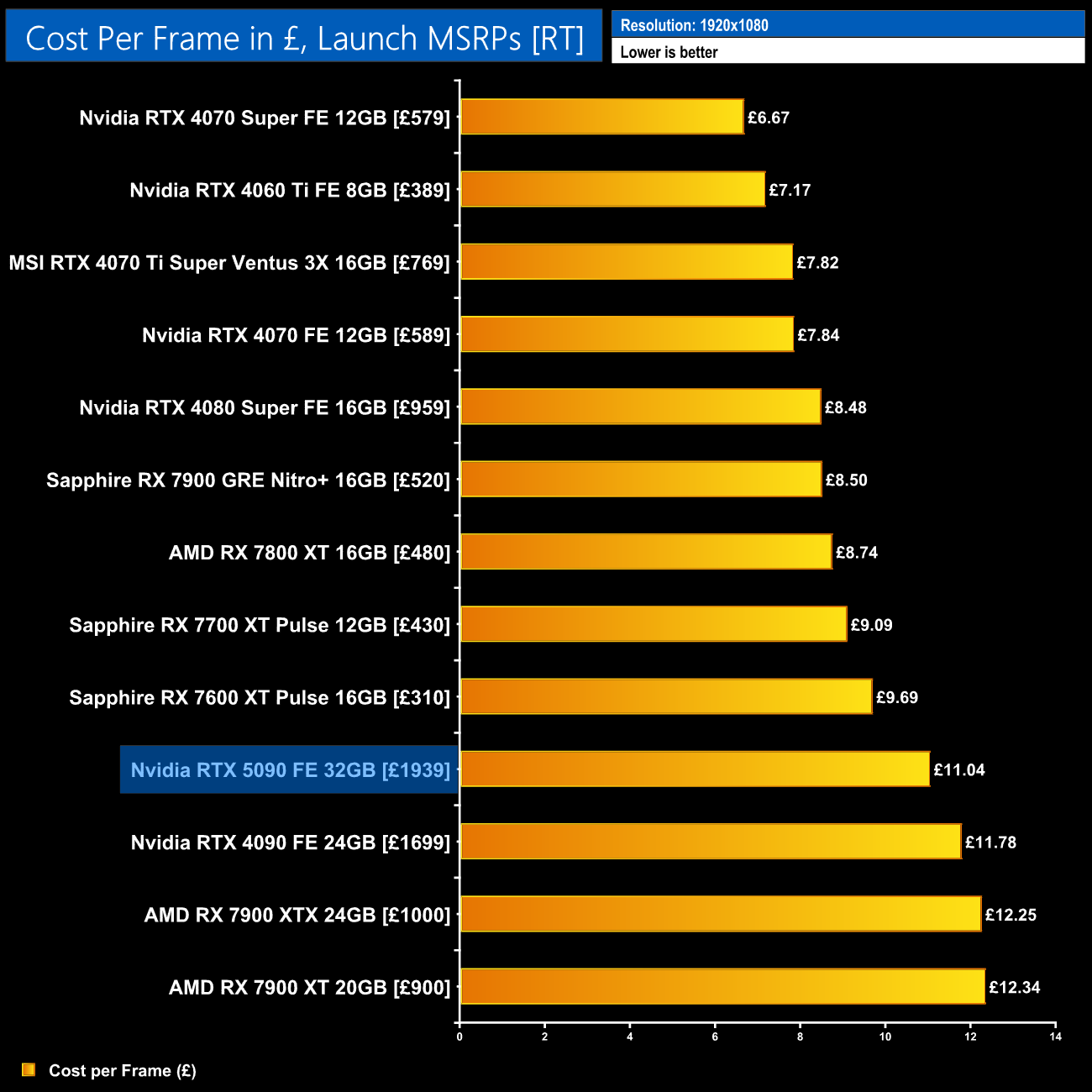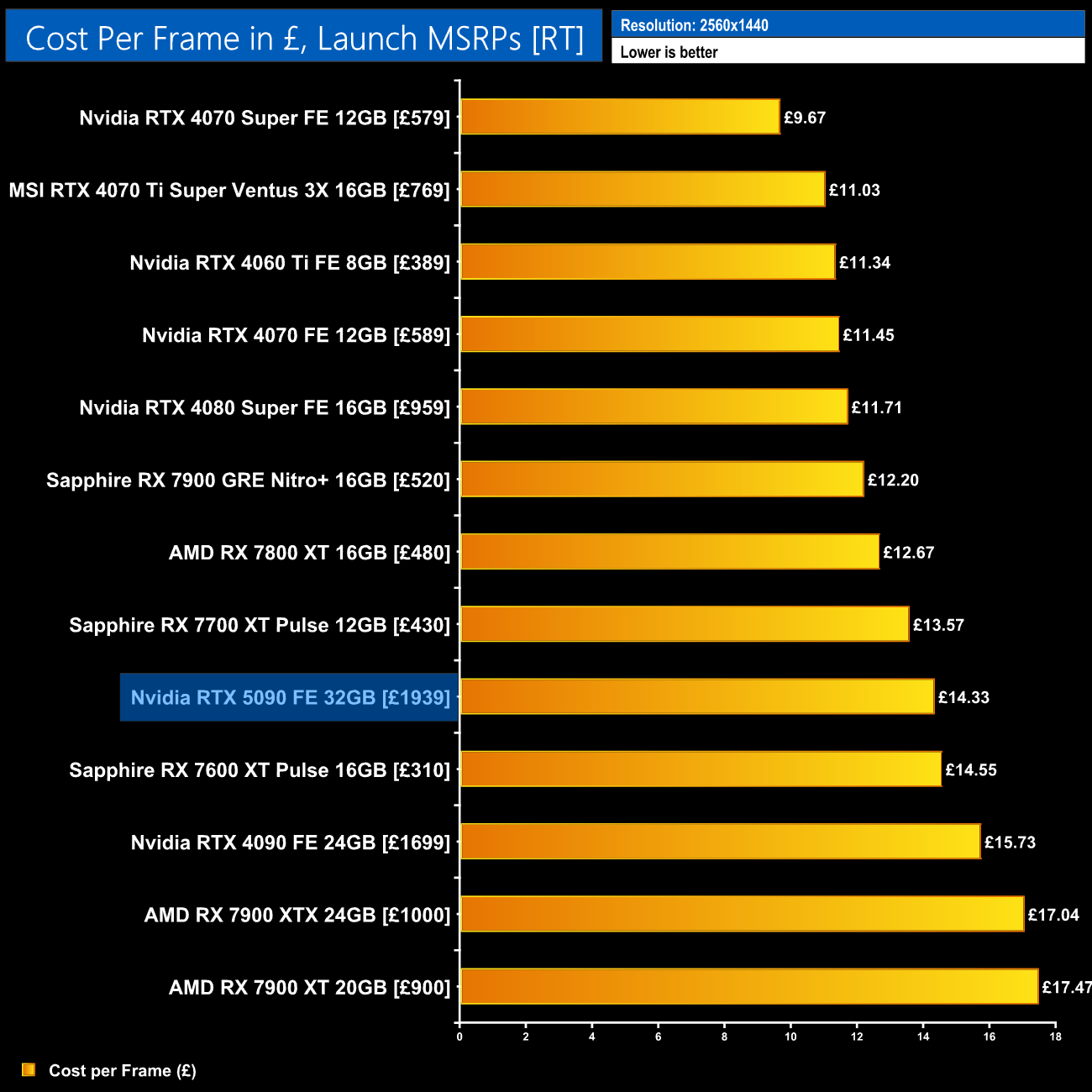 Interestingly, overall value does look considerably better when looking at the data based on our ray traced numbers. Granted, the 5090 is still hardly jaw-dropping in this regard, but its performance being so much better than anything AMD has to offer makes it a much better value if ray tracing is your primary concern. It remains to be seen if RDNA 4 is able to change that!