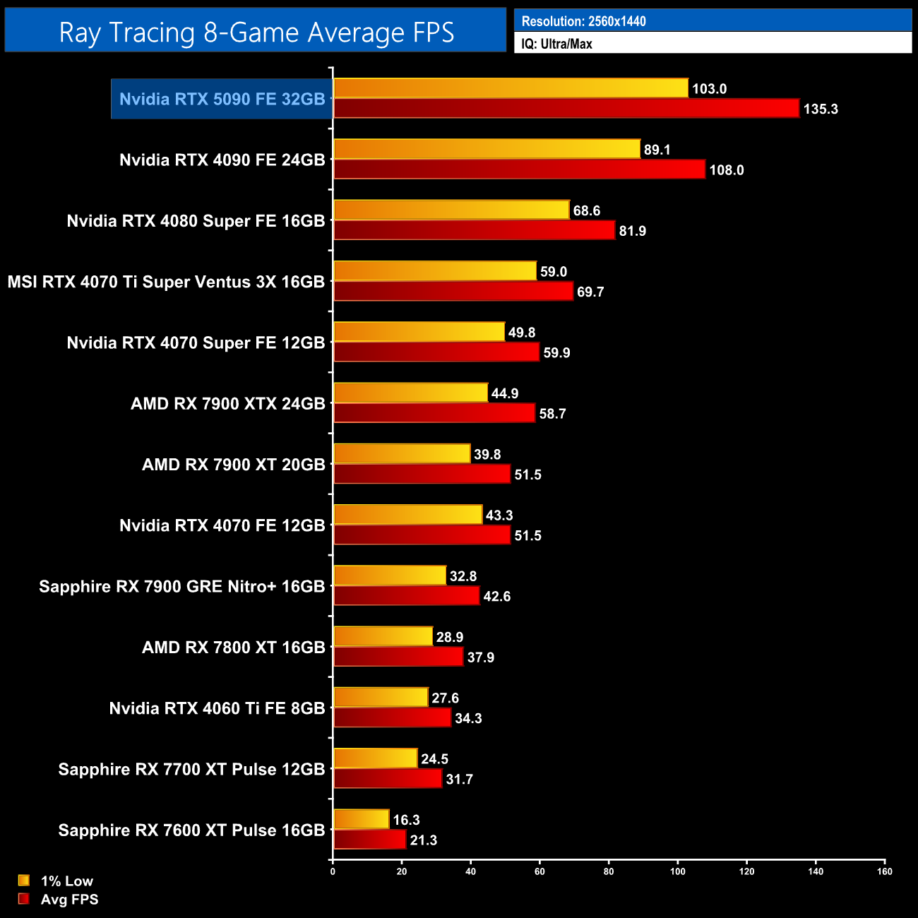 Overall performance with ray tracing enabled scales very similarly to what we saw from the rasterised numbers. I was expecting a slightly bigger gain, relative to the 4090, when enabling RT, but at 1440p the 5090 is 25% faster, and that increases to 29% at 4K, which is the exact same margin of difference we saw in our 12-game rasterisation average.