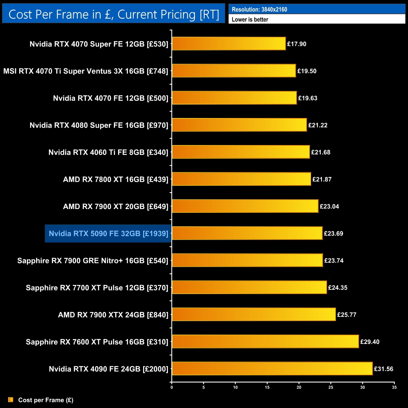 The picture does change slightly when looking at the data based on current pricing, mainly because a lot of GPUs have received hefty discounts over the course of their life cycles, but the 5090 is still middle of the pack at 4K.