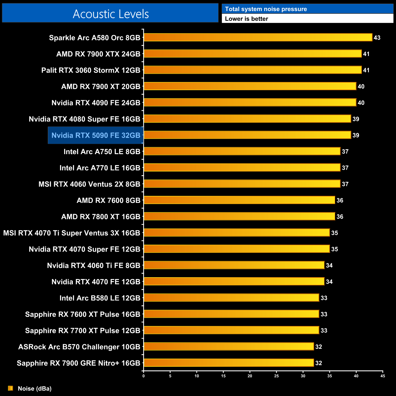 Despite running at very reasonable temperatures, the 5090 Founders Edition does not compromise on noise levels either. I mean, it's not silent by any means, hitting 39dBa on the sound meter, and that was with fan speed reported at 46%, or 1585rpm. Again though, for a dual-slot card that draws 575W of power (!) I think this is very impressive indeed.