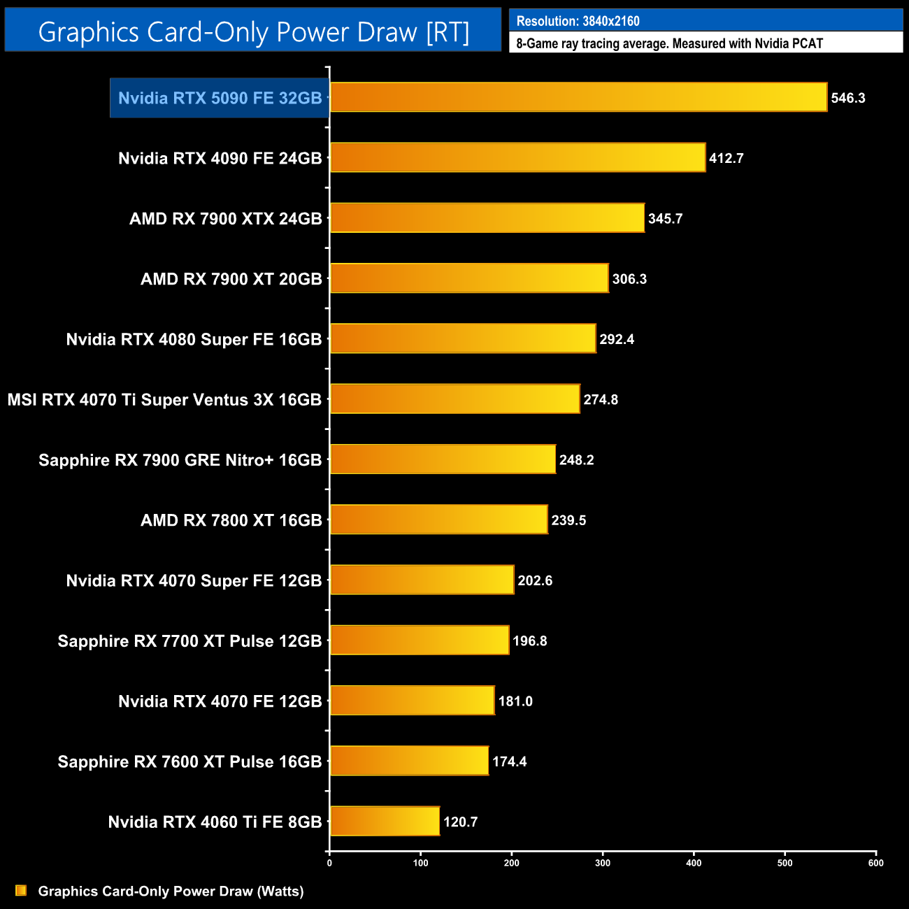 With ray tracing enabled, that figure gets even higher! Now we're looking at 546.3W on average, with Star Wars: Outlaws even hitting 580W power draw…