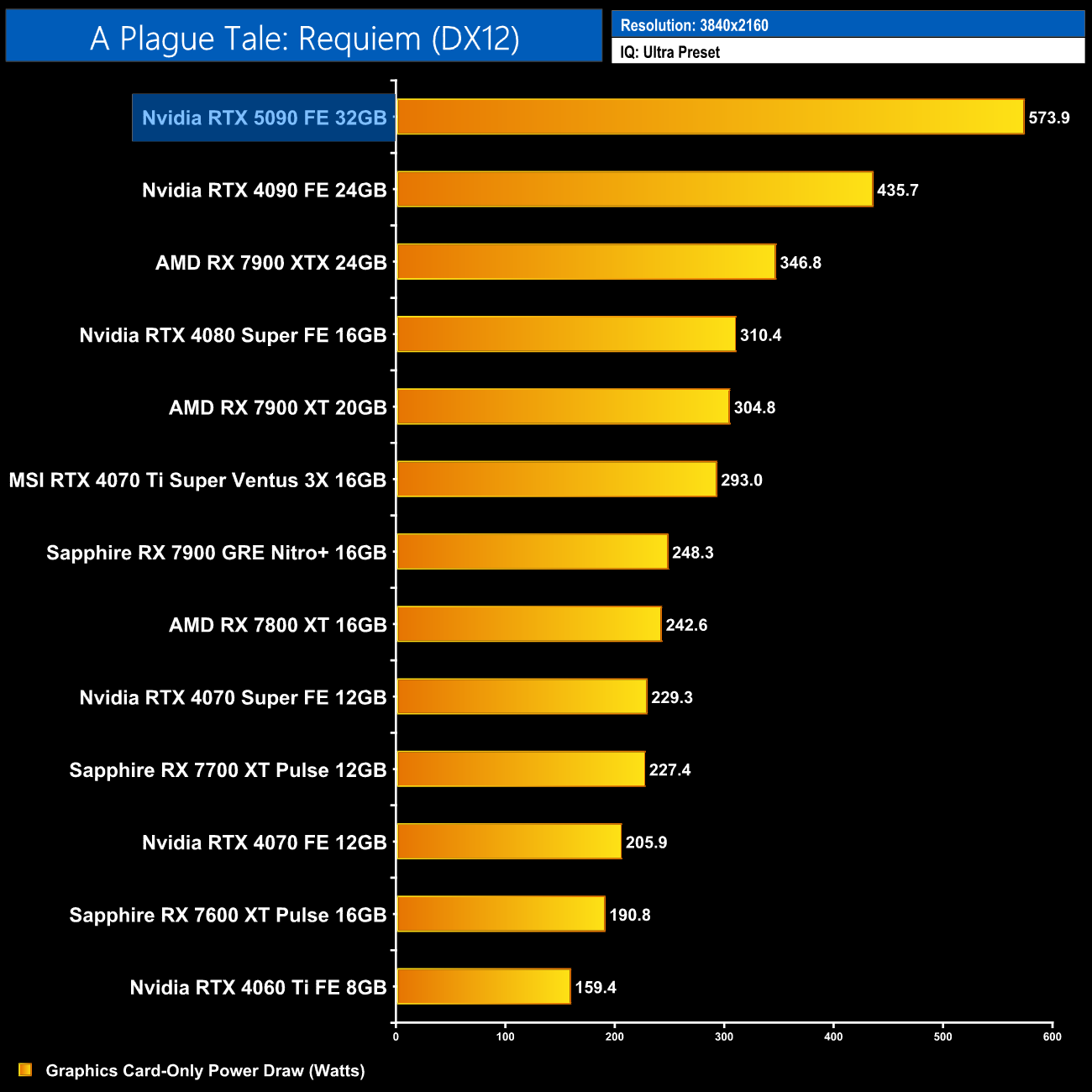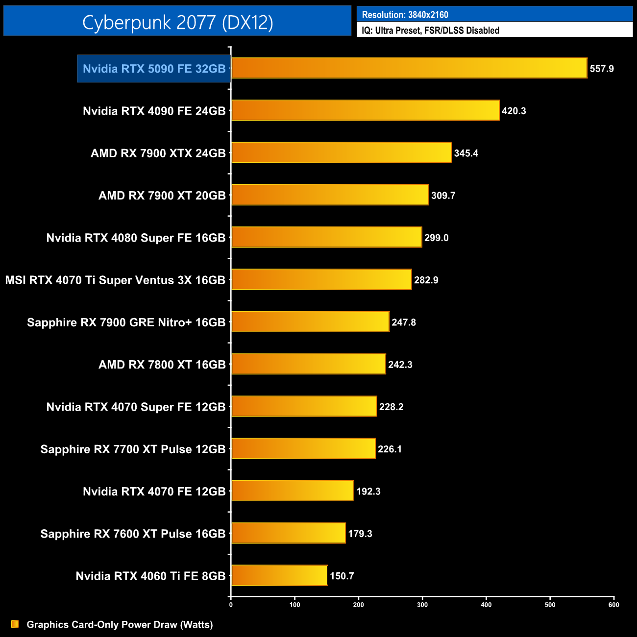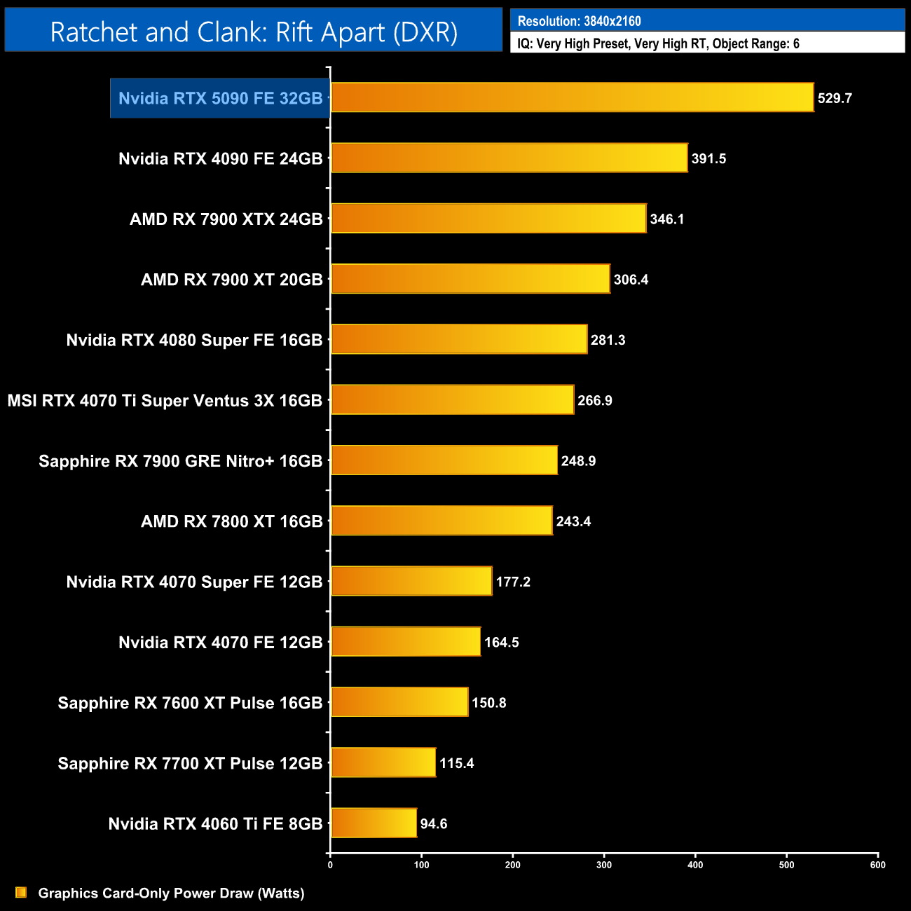 Up at 4K, power draw gets to its highest level from the RTX 5090, as we'd expect. Now a number of games pull well over 520W, though there's still a few that are closer to 400-450W. Even so, that is quite a remarkable amount of juice for a single graphics card, marking a 30% increase in power draw versus the 4090.