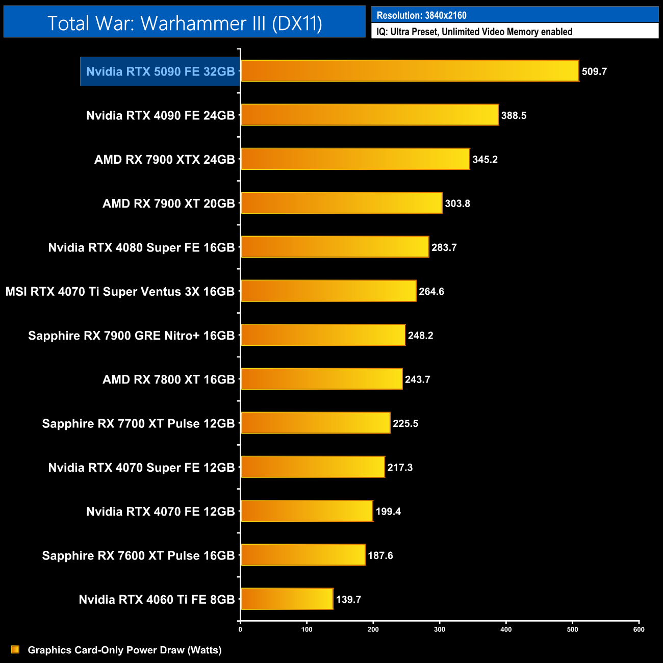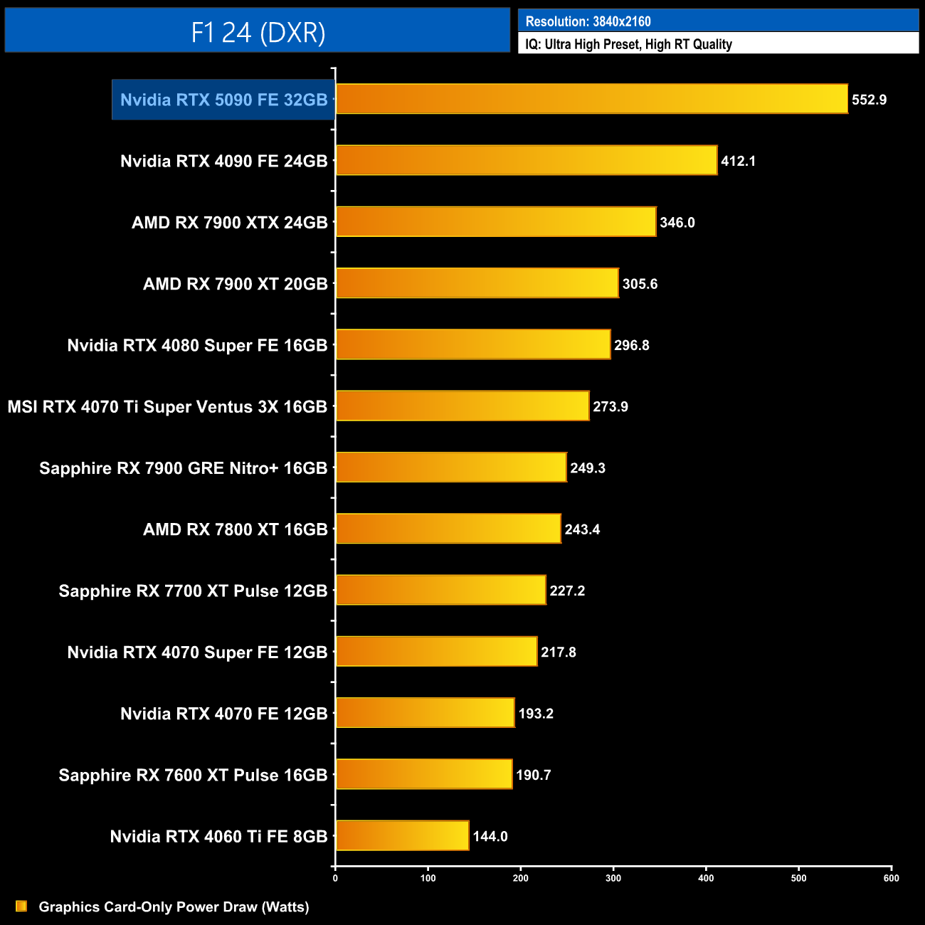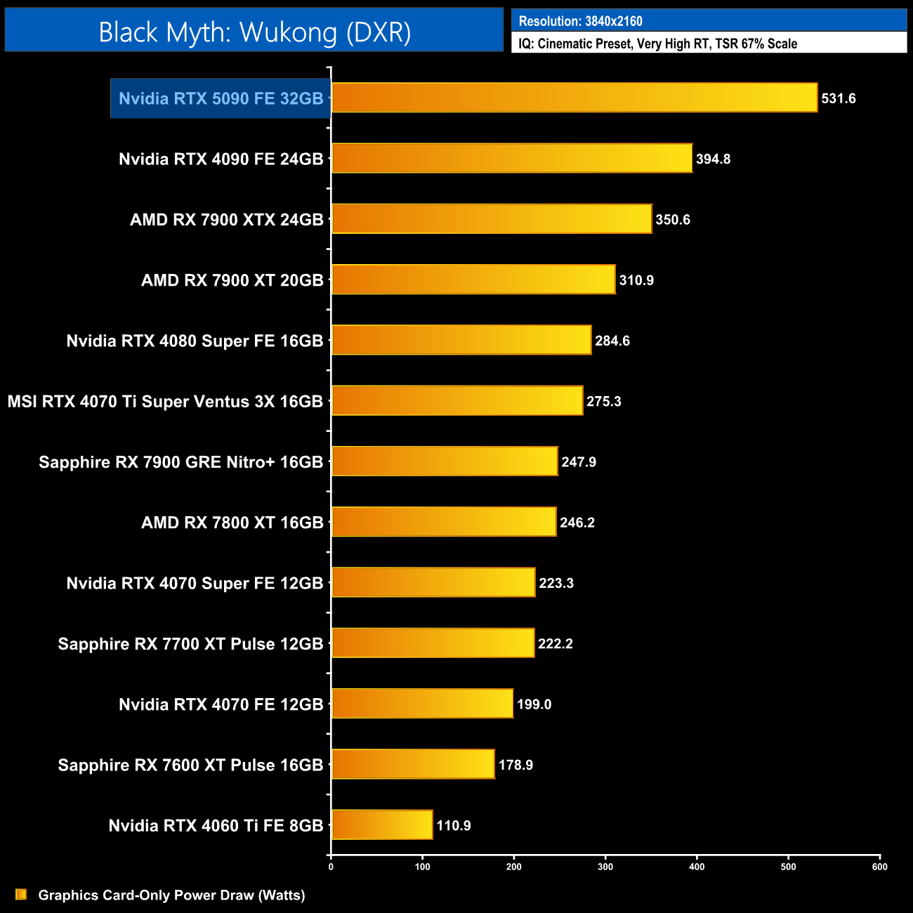 Up at 4K, power draw gets to its highest level from the RTX 5090, as we'd expect. Now a number of games pull well over 520W, though there's still a few that are closer to 400-450W. Even so, that is quite a remarkable amount of juice for a single graphics card, marking a 30% increase in power draw versus the 4090.