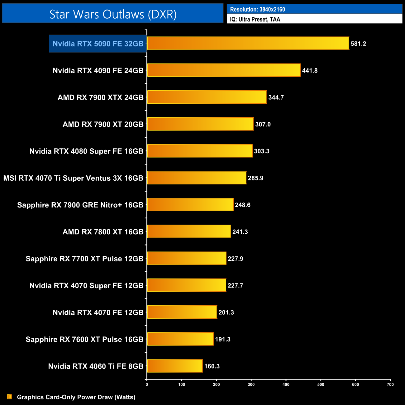 With ray tracing enabled, that figure gets even higher! Now we're looking at 546.3W on average, with Star Wars: Outlaws even hitting 580W power draw…