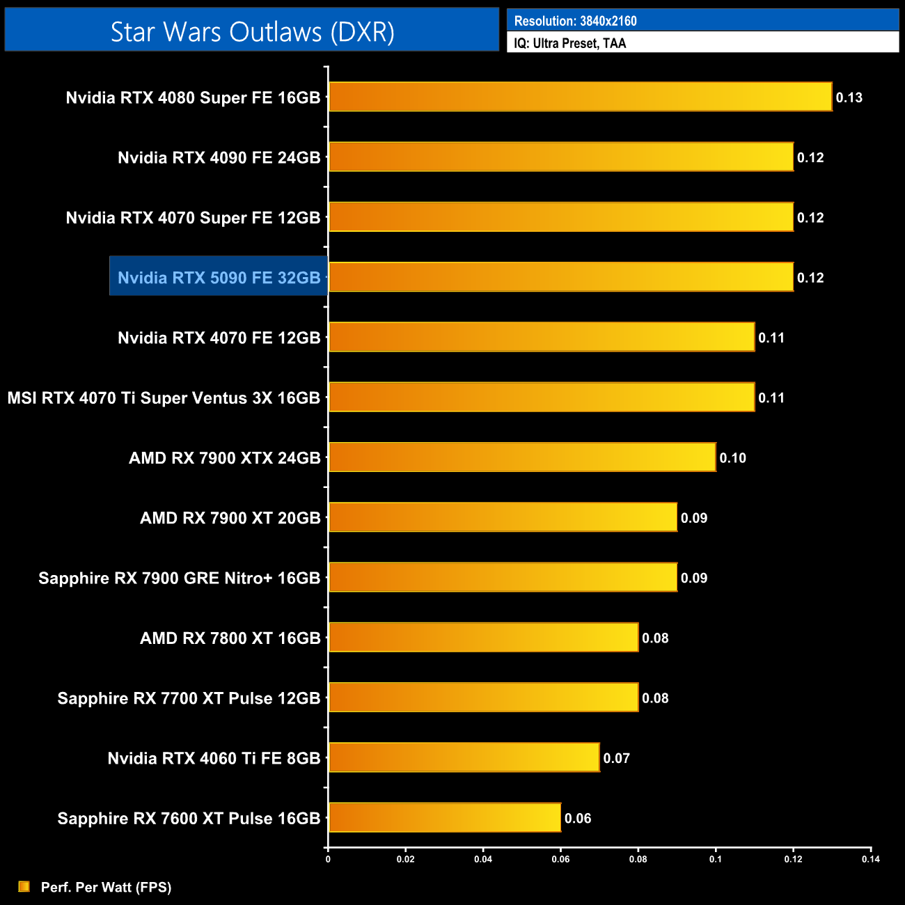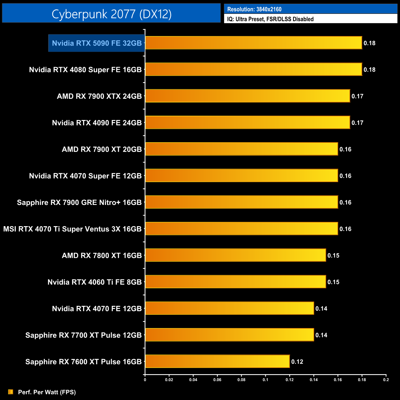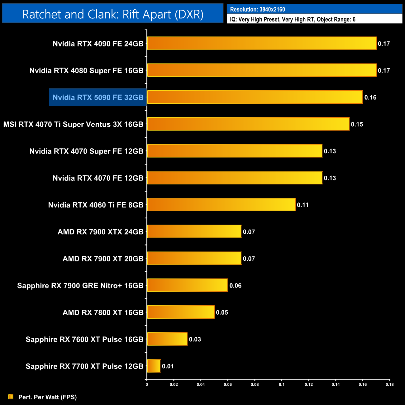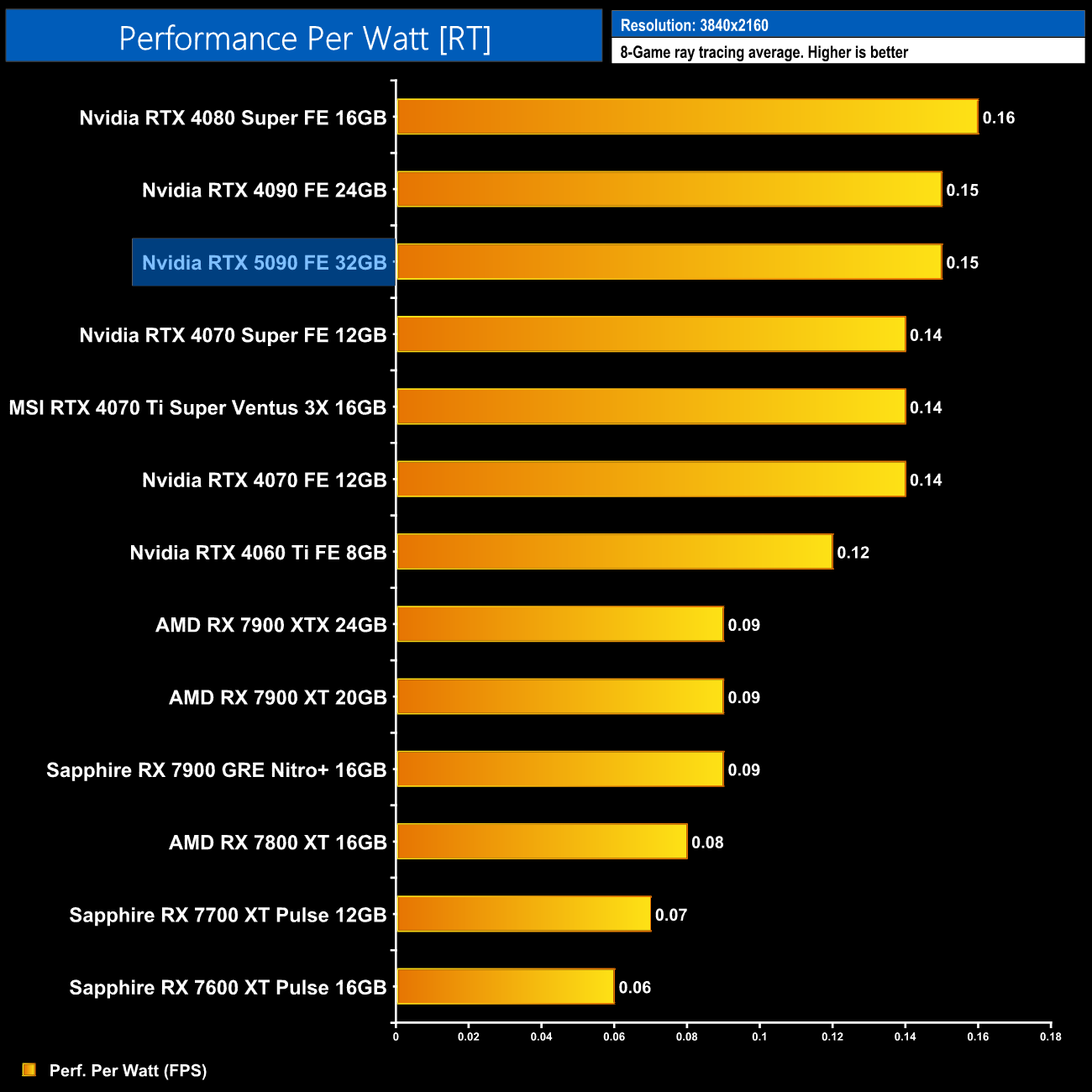 Now, at 4K, the RTX 5090 does close the gap slightly, but it still lags behind the 4090 and 4080 Super – this time it offers performance per Watt that's 5% lower. Of course you may not be bothered by that, but I find it fascinating that Nvidia has clearly had to push things further than ever before to squeeze out that extra performance over the 4090, to the point where performance per Watt has actually gone backwards due to such an increase in power draw!