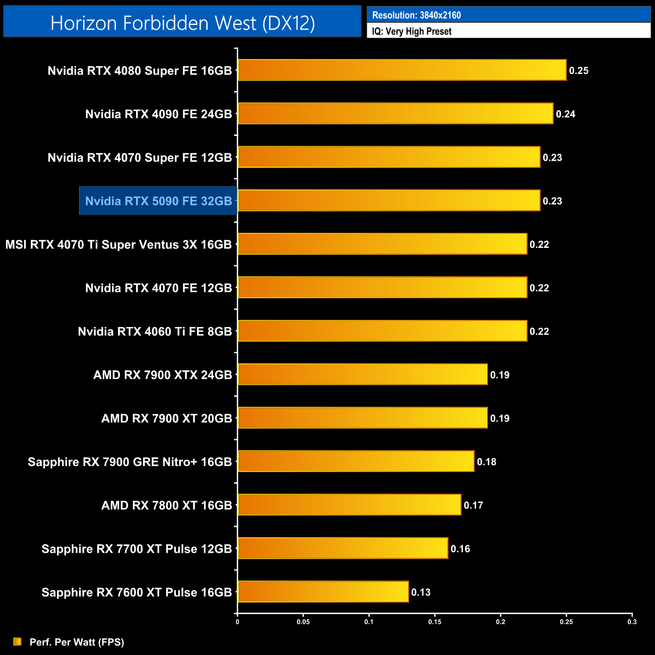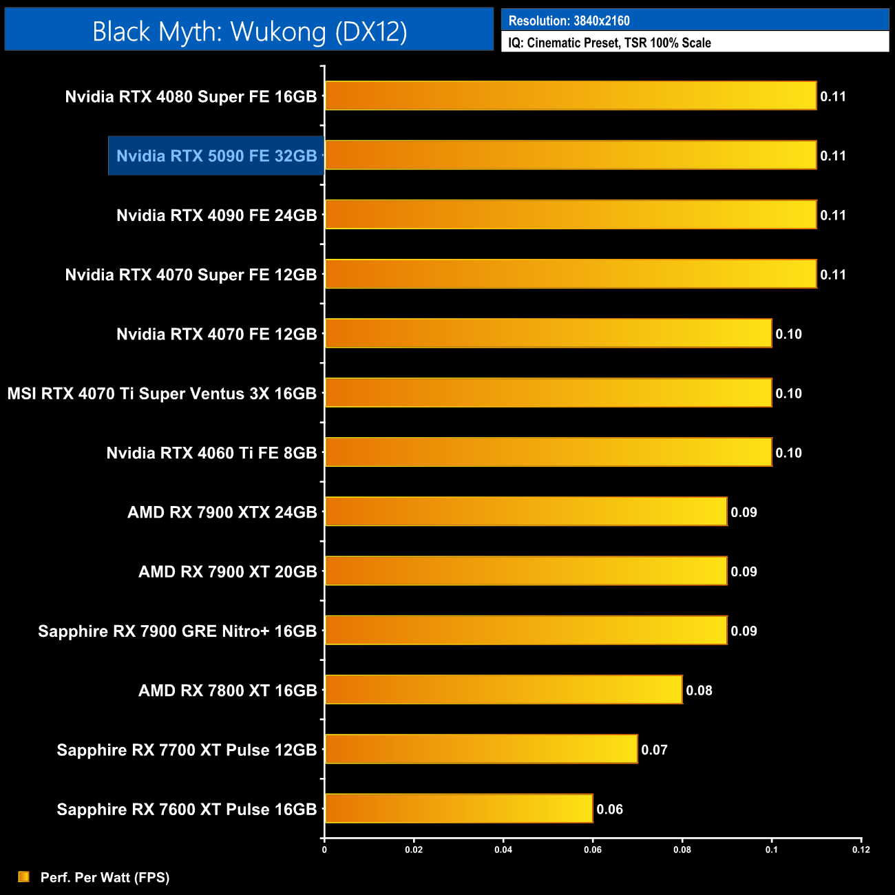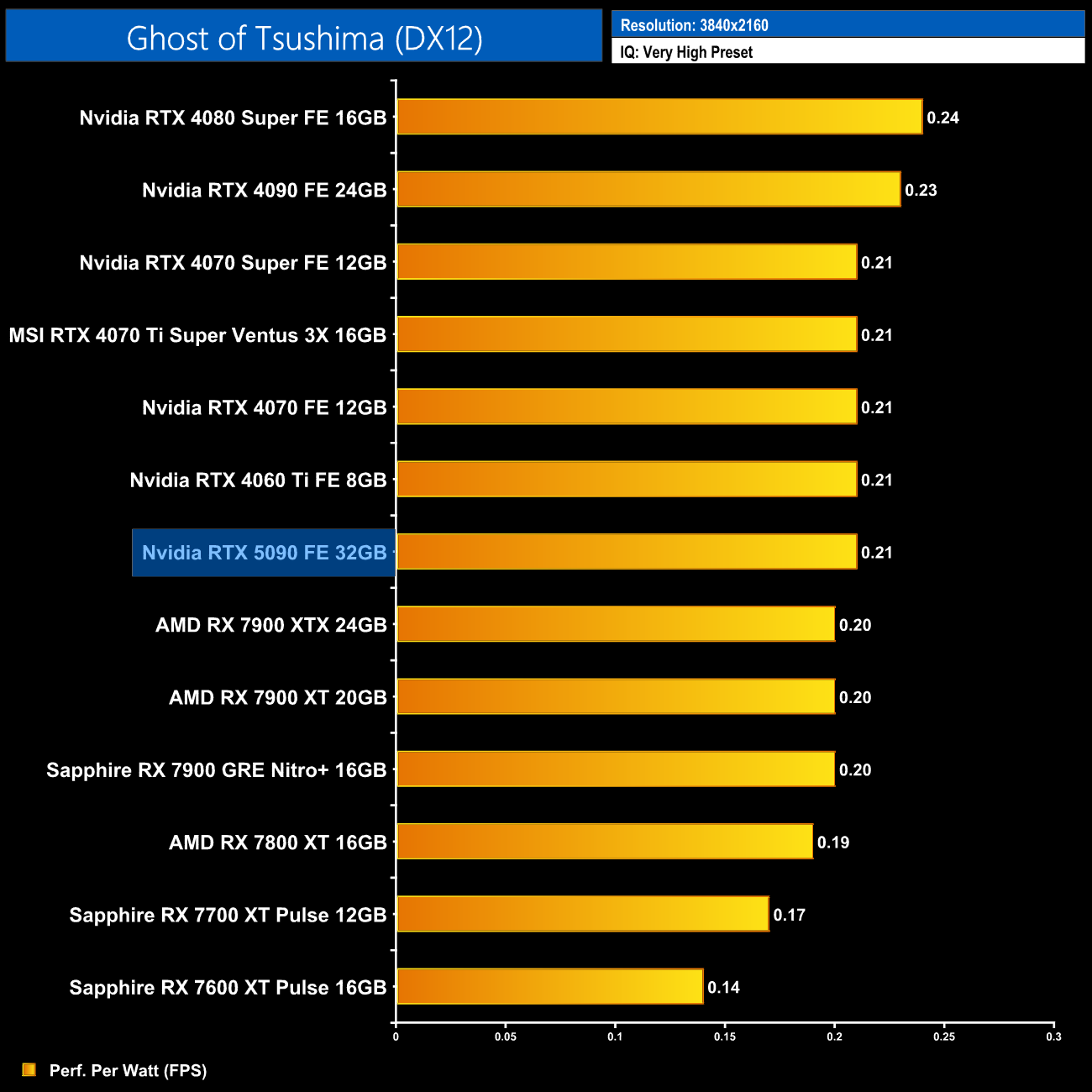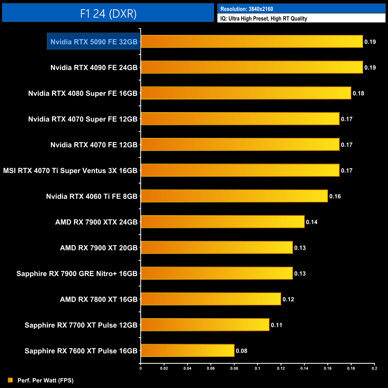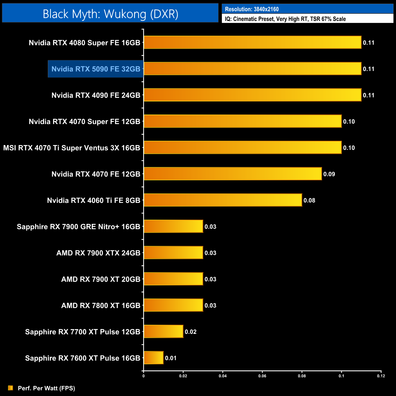 Now, at 4K, the RTX 5090 does close the gap slightly, but it still lags behind the 4090 and 4080 Super – this time it offers performance per Watt that's 5% lower. Of course you may not be bothered by that, but I find it fascinating that Nvidia has clearly had to push things further than ever before to squeeze out that extra performance over the 4090, to the point where performance per Watt has actually gone backwards due to such an increase in power draw!