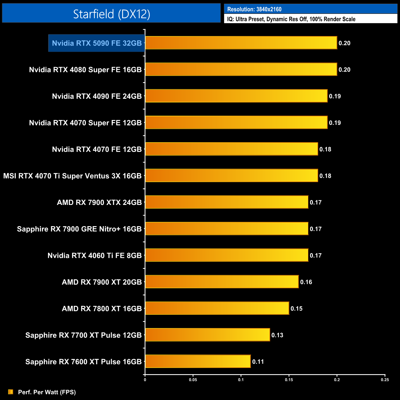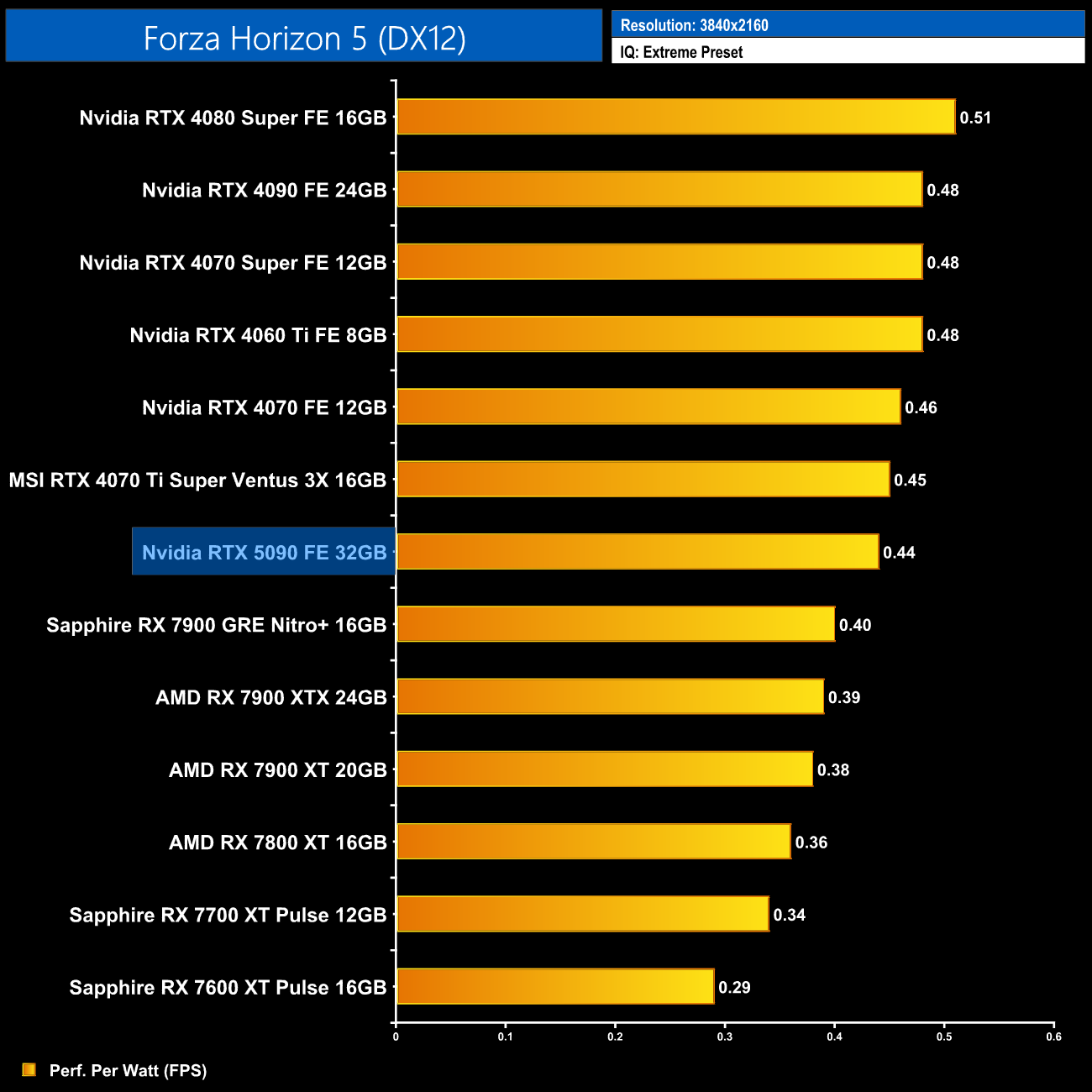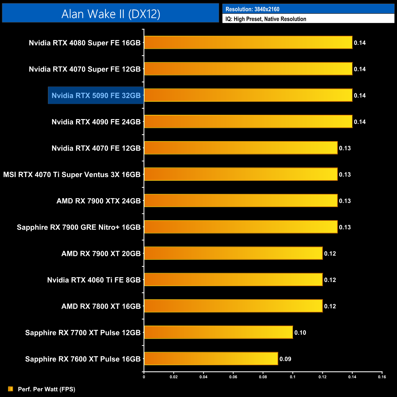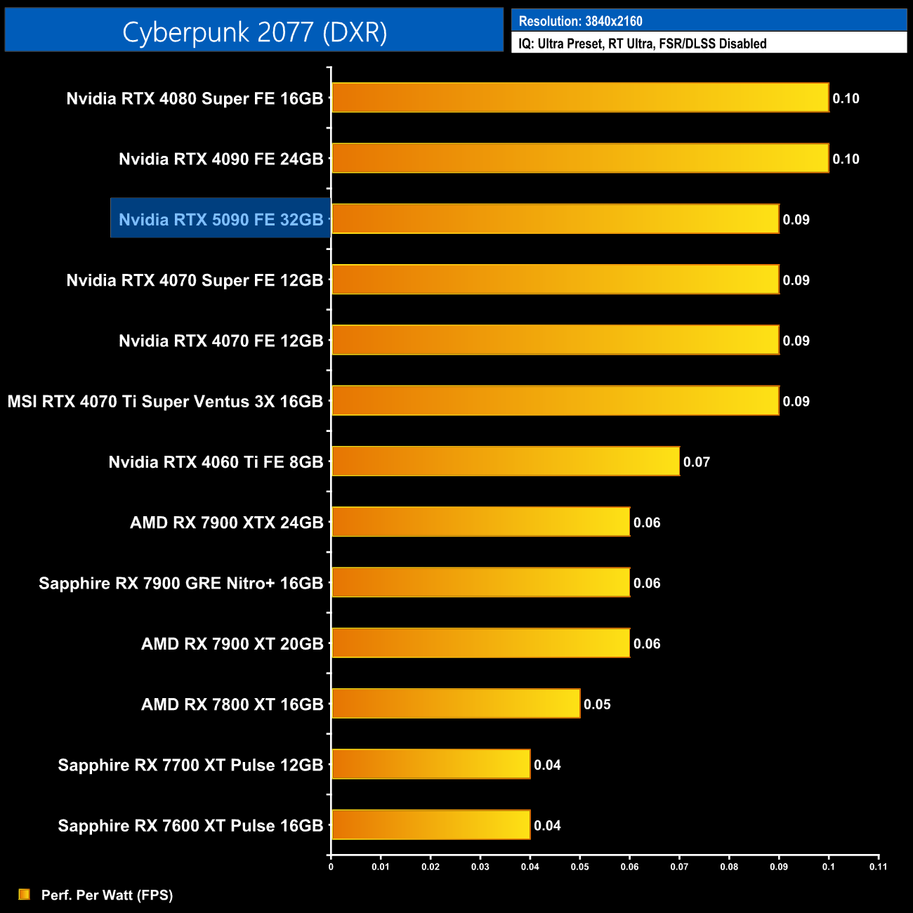 Now, at 4K, the RTX 5090 does close the gap slightly, but it still lags behind the 4090 and 4080 Super – this time it offers performance per Watt that's 5% lower. Of course you may not be bothered by that, but I find it fascinating that Nvidia has clearly had to push things further than ever before to squeeze out that extra performance over the 4090, to the point where performance per Watt has actually gone backwards due to such an increase in power draw!