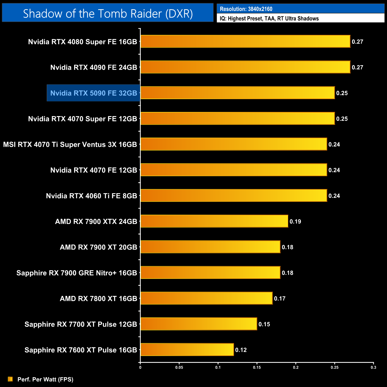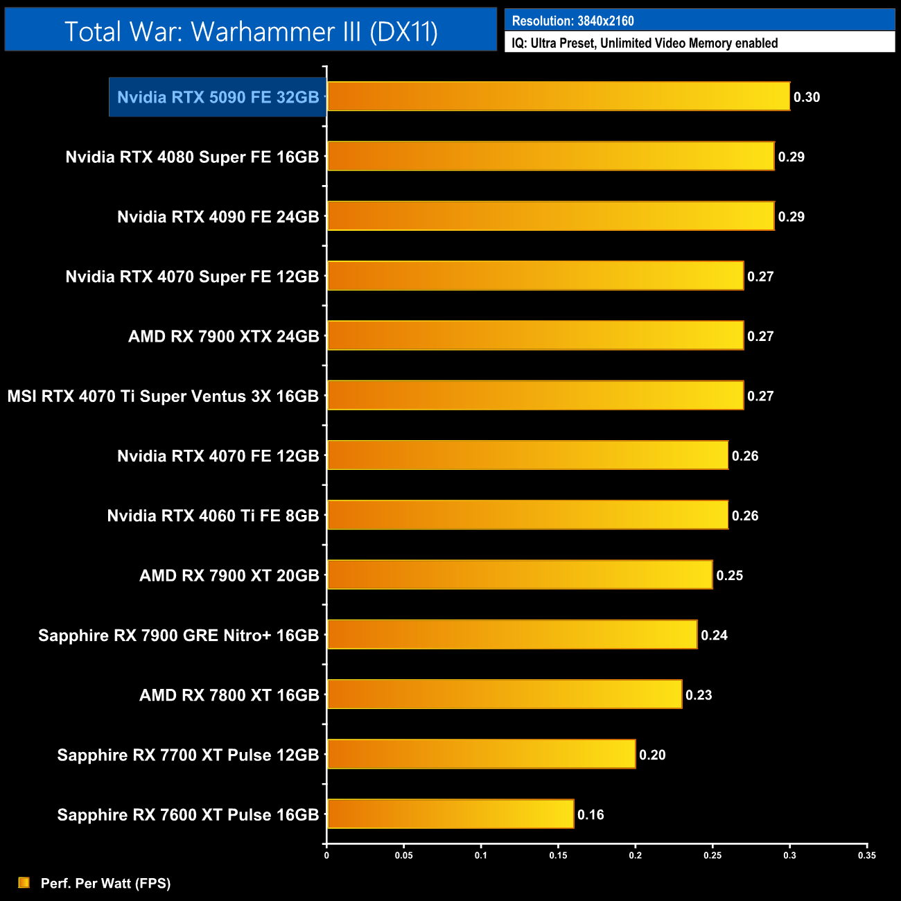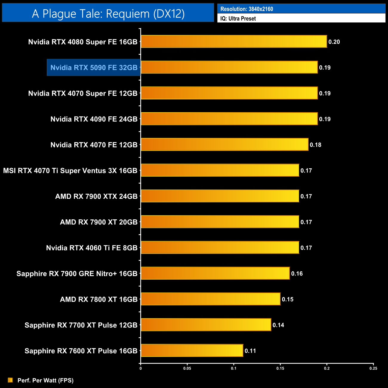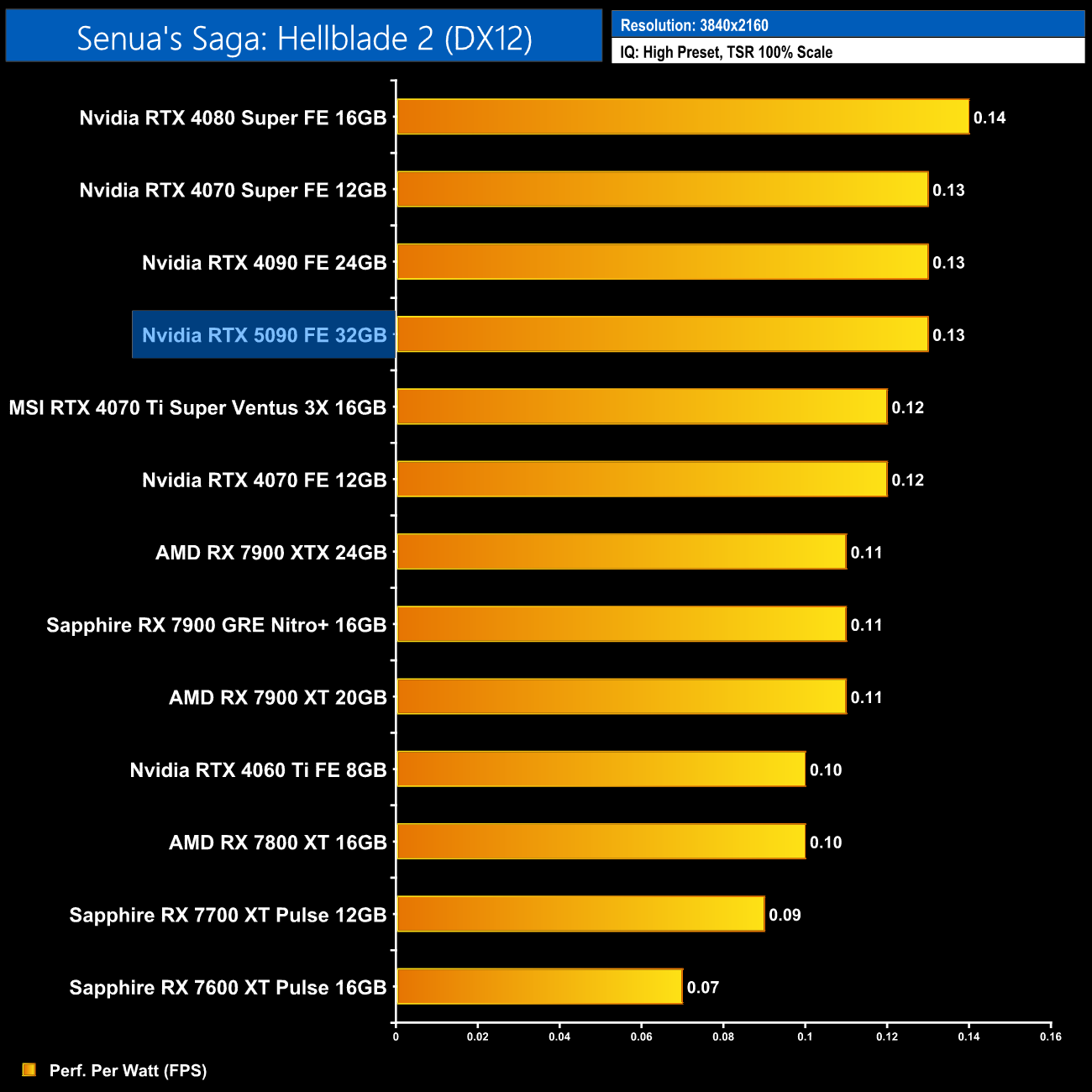 Using the graphics card-only power draw figures presented earlier in the review, here we present performance per Watt on a per-game basis for all twelve games we tested at 2160p (4K).