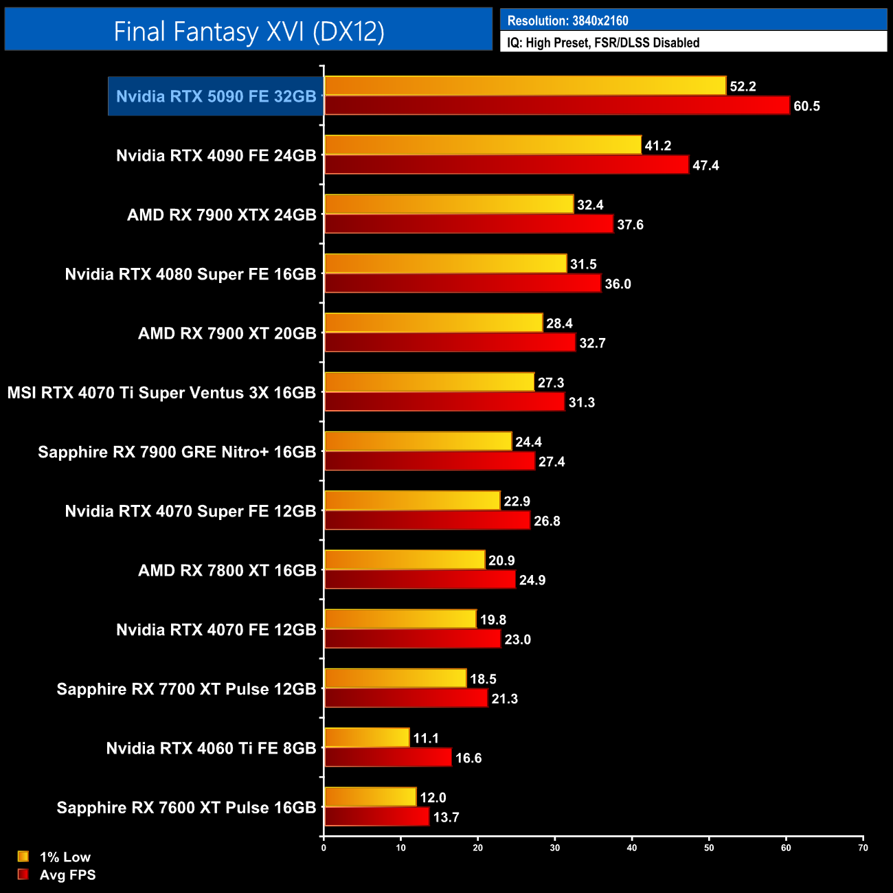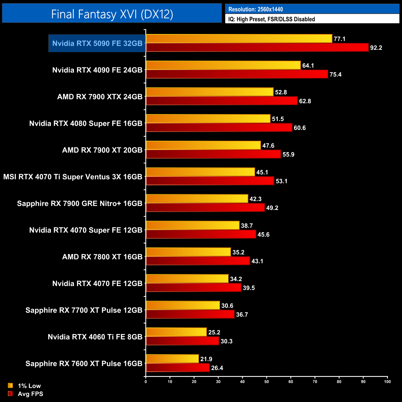 Final Fantasy XVI is another very GPU-heavy title, and at 1440p the RTX 5090 hits 92ps, giving it a 25% lead over the 4090, while it's 47% faster than the 7900 XTX.