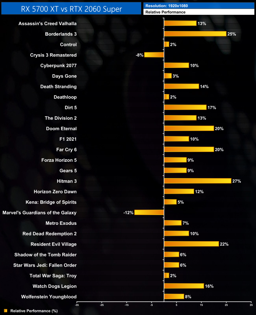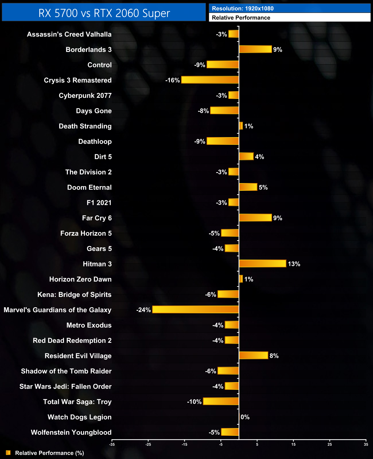Moving on, we are now looking at the RX 5700 (non-XT) up against the RTX 2060 Super. Despite the RX 5700 launching at £329, making it £50 cheaper than the RTX 2060 Super, things are generally neck-and-neck across our testing. There are a few results where we see significant performance swings – like Crysis 3 Remastered, Hitman 3 and Guardian's of the Galaxy – but twenty-three of the games tested see less than a 10% difference either way, and fifteen of those show a difference of 5% or less.