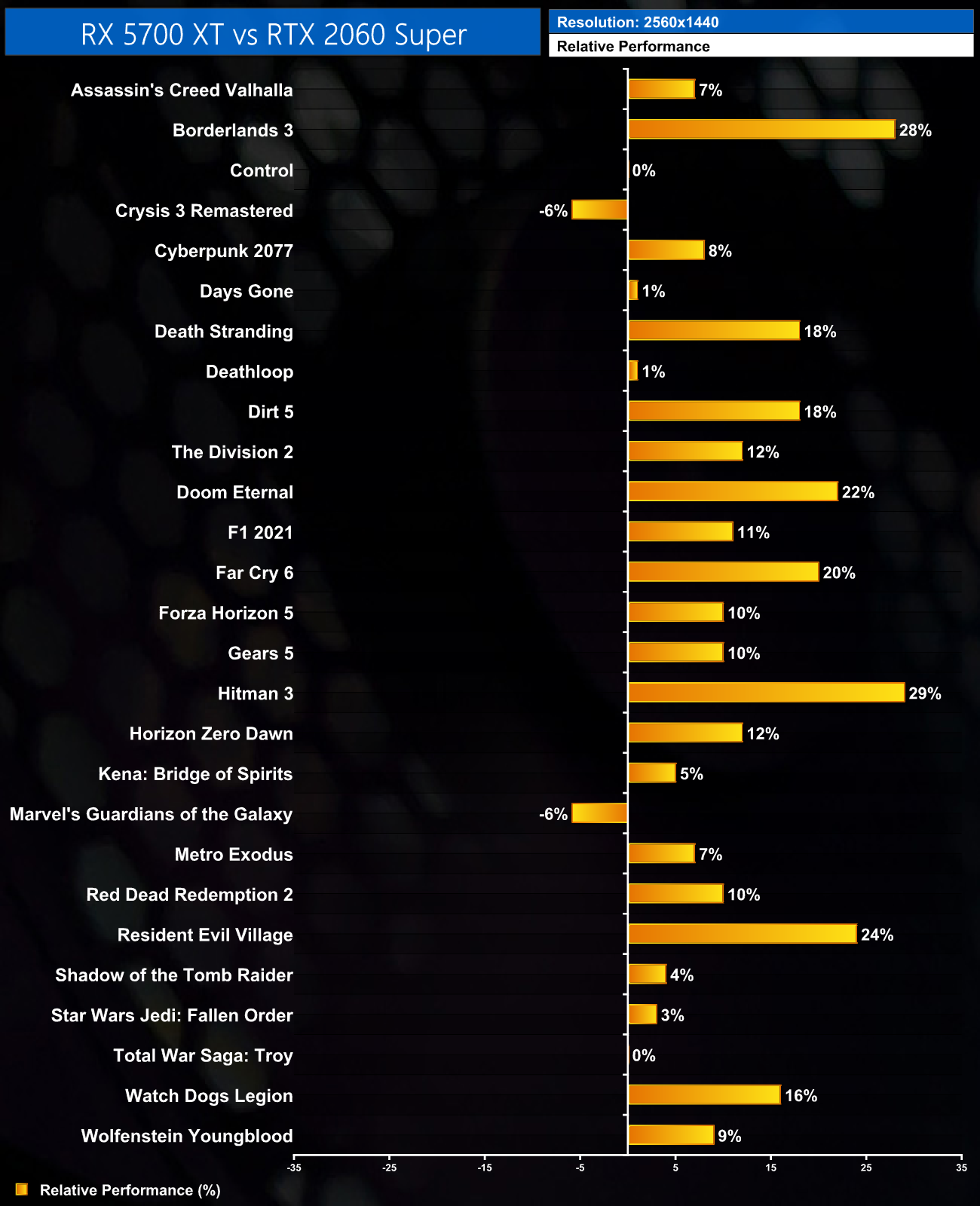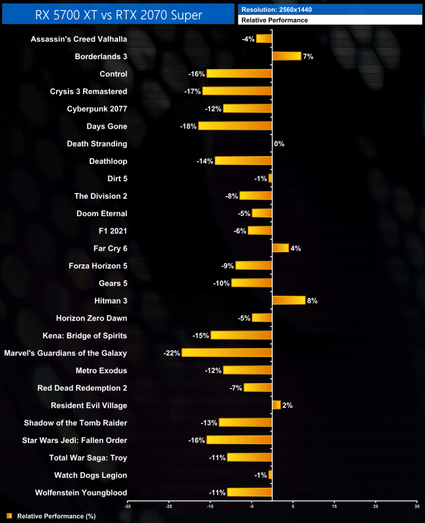 The RX 5700 XT does slightly better against the RTX 2060 Super once we step up to 1440p as well. Here, in the two games where it is slower, the deficit is cut to just 6% in both instances. On the other side, the 5700 XT is 28% and 29% faster in Borderlands 3 and Hitman 3, respectively.