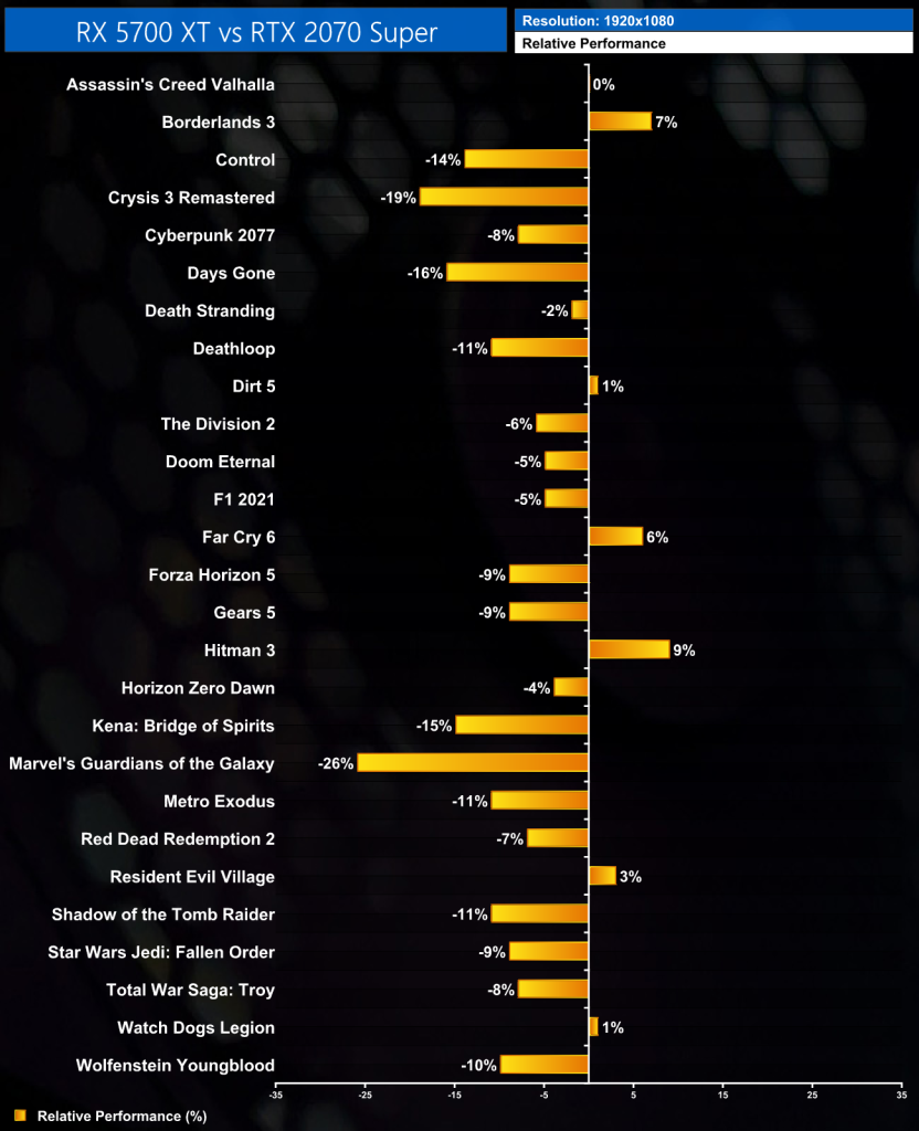 Starting with the RX 5700 XT's performance relative to the RTX 2070 Super at 1080p, we can see the RX 5700 XT is clearly the slower of the two. Not always by a lot, and it is still faster in six of the twenty-seven games we tested. There are a few significant losses however, most notably in Guardians of the Galaxy, while Unreal Engine 4 titles – including Days Gone and Kena: Bridge of Spirits – also show sizeable performance deficits.
