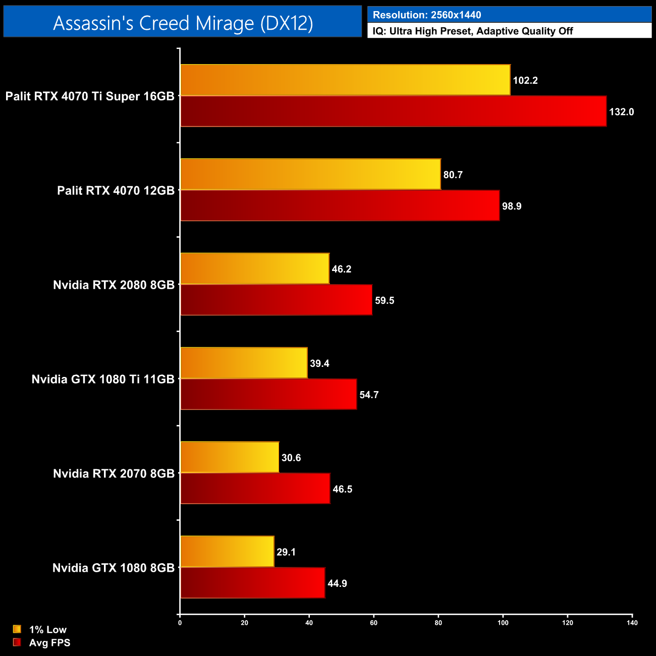 Next up we have Assassin’s Creed Mirage. This one is playable on the older GPUs, at least from the RTX 2070 which can just keep above 30fps for the 1% lows – but there is a clear leap in performance from even the RTX 2080 up to the RTX 4070m given the Palit card is 66% faster. The 4070 Ti Super also breaks past 100FPS with ease, and is again over twice as fast as the RTX 2080.