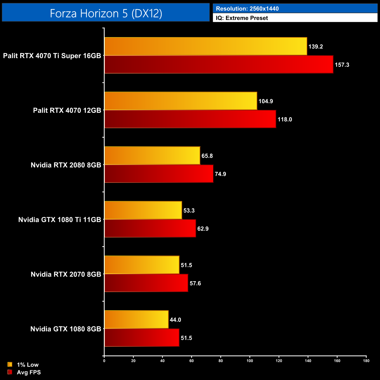 Moving on, Forza Horizon 5 as we know is a very well optimised title and you can still get 50FPS even with the GTX 1080. However, if you want to enjoy the benefits of a higher refresh-rate monitor, you’ll need something like the 4070, which is capable of nearly 120FPS, or the 4070 Ti Super, which is over twice as fast as the RTX 2080.
