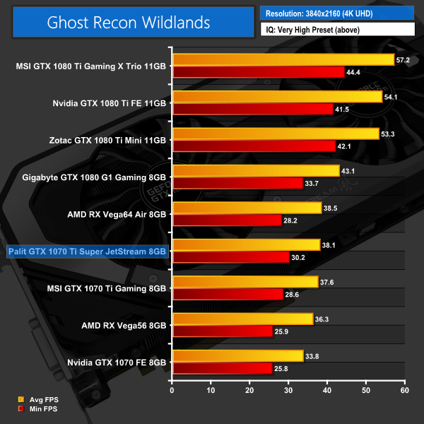 Wildlands is more favourable to Nvidia hardware so here we see the 1070 Ti stay ahead of Vega56 across all three resolutions tested. At 1080p, the Super JetStream even beats Vega64.