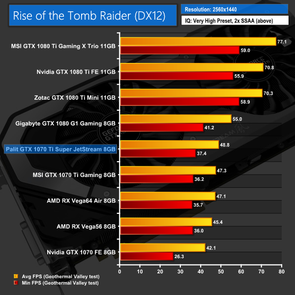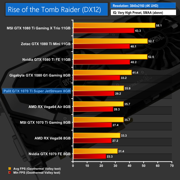 Our last game today, ROTTR is another game favourable to Palit's 1070 Ti – it again beats both Vega cards and the MSI 1070 Ti Gaming 8G.