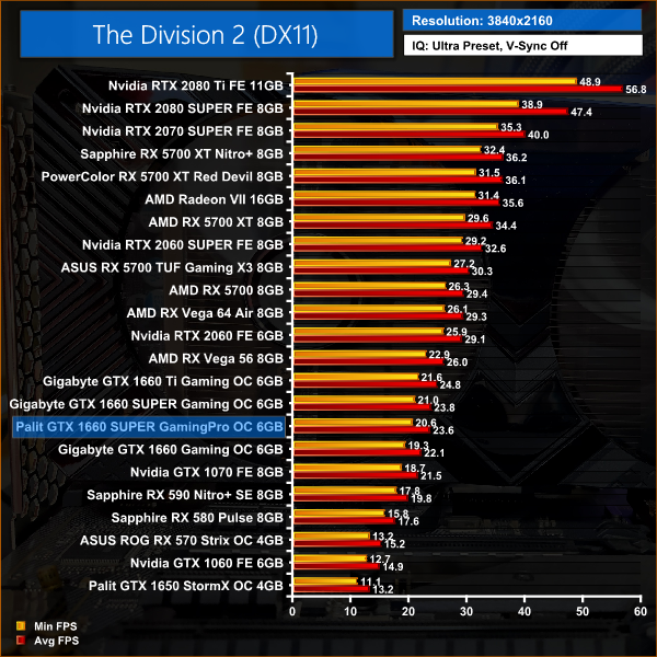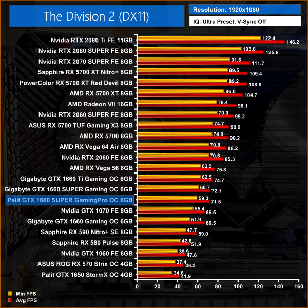 When playing The Division 2, we saw smaller gains for 1660 SUPER versus the 1660 – 7% on average. It's also 5% slower than the 1660 Ti here, which is the biggest gap between those two cards we saw across all of our testing today.