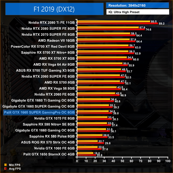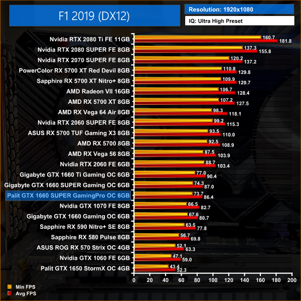 In a very similar manner to The Division 2, Palit's 1660 SUPER is 7% faster than the 1660 in F1 2019. It's also 4% slower than the 1660 Ti, but 8% faster than RX 590.