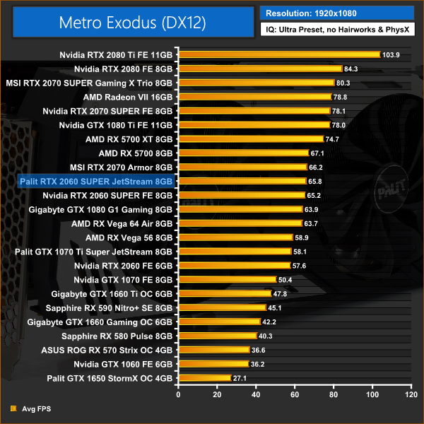 Metro Exodus shows a similar pattern to our first game of the day, Battlefield V. There's hardly anything between our two 2060 SUPER cards at 1080p, but at 1440p and 4K the gap widens considerably with the Palit card 6-7% faster.